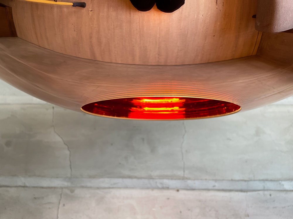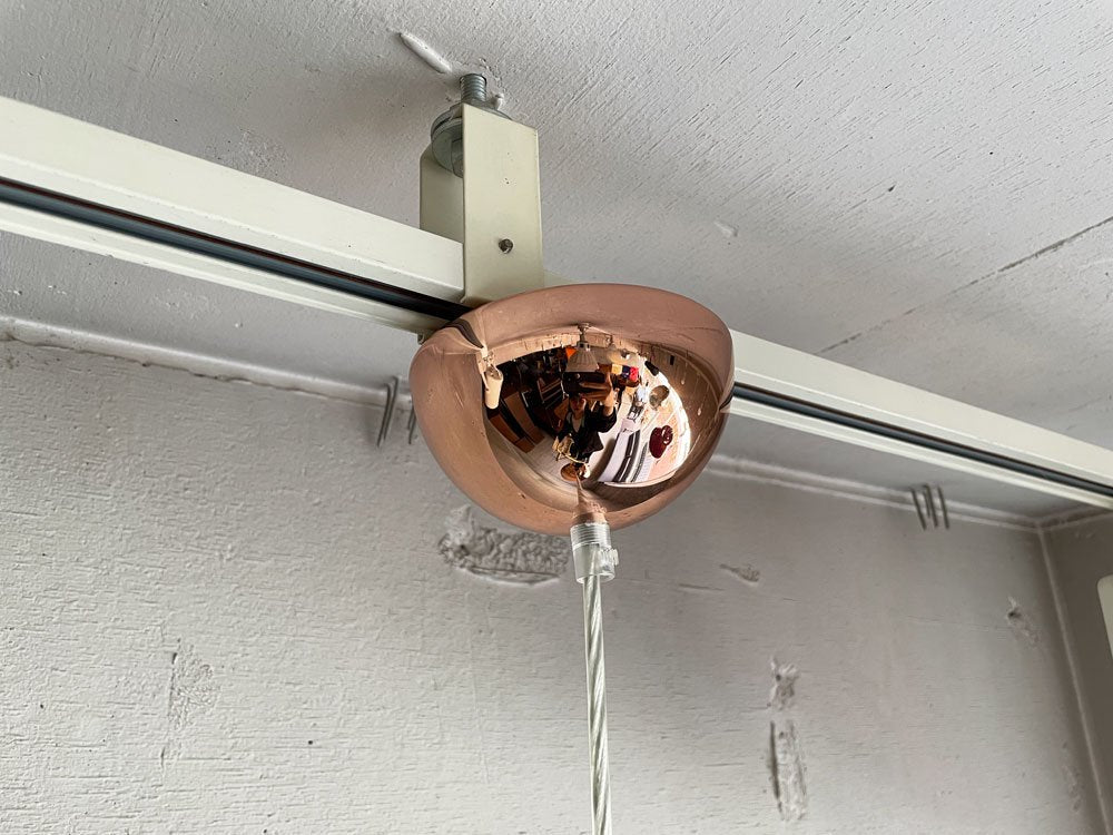 型に空気を吹き込むブロー製法で作られたシェードに、宇宙飛行士のバイザーにも用いられる真空蒸着加工で銅を吹き付け、鏡面に仕上げられています。
