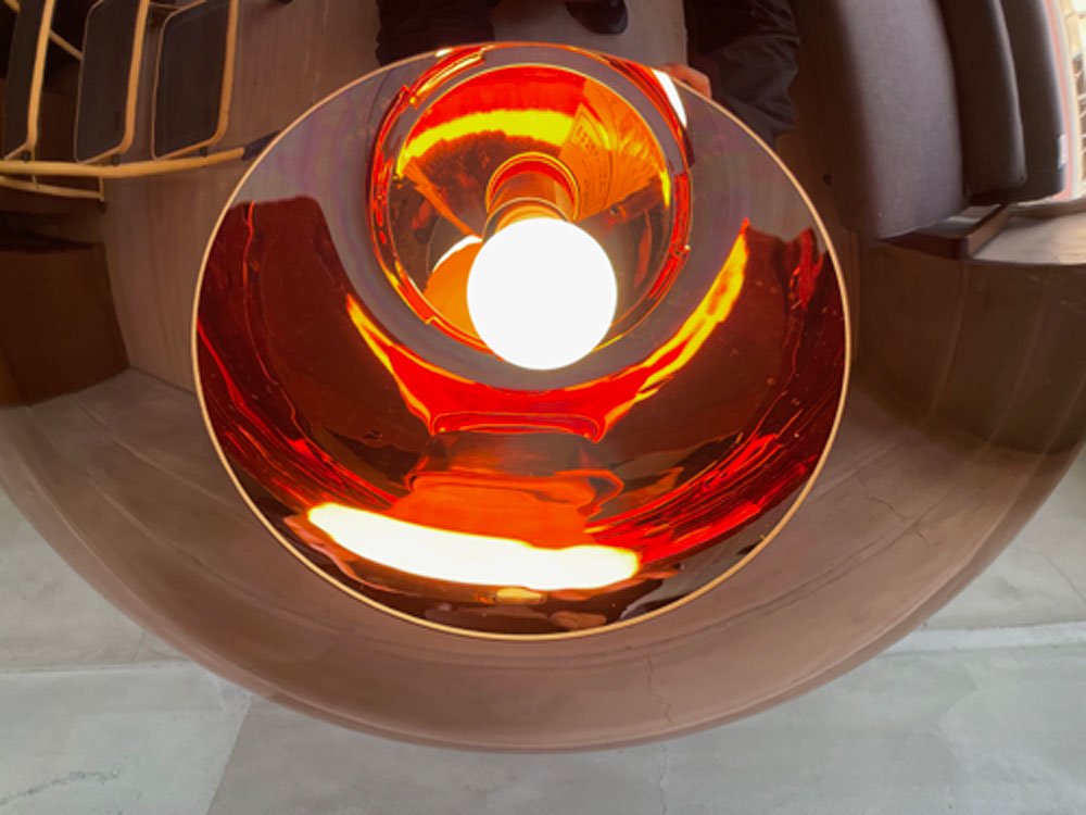 鏡面仕上げという唯一無二の特徴は、トムディクソンが「反射」と「透過」の視覚効果に着目したことで生まれたもので、周囲の風景と本体の光が映り込み反射することで空間に圧迫感を与えずにシェードを溶け込ませています。
