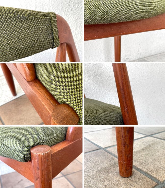 こちらはビンテージ品です。使用と経年に伴い張地にはほつれ、擦れやネップ、フレームには擦れ、打痕や色抜けが散見されますが、味としてお楽しみ頂けます。脚は後年僅かにカットされておりますが、座面高はダイニングテーブル等と合わせて問題なくご使用いただける44cmです。ガタツキやヘタリ等使用上問題となるダメージも見られず、ビンテージ品としましては概ね良好なコンディションを保っております。