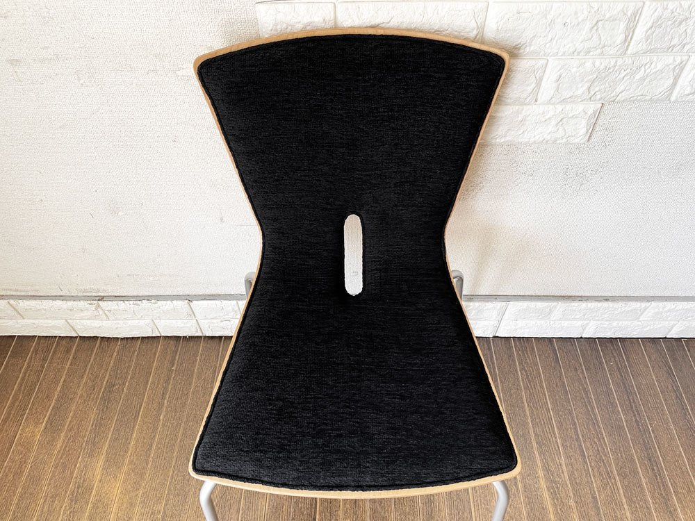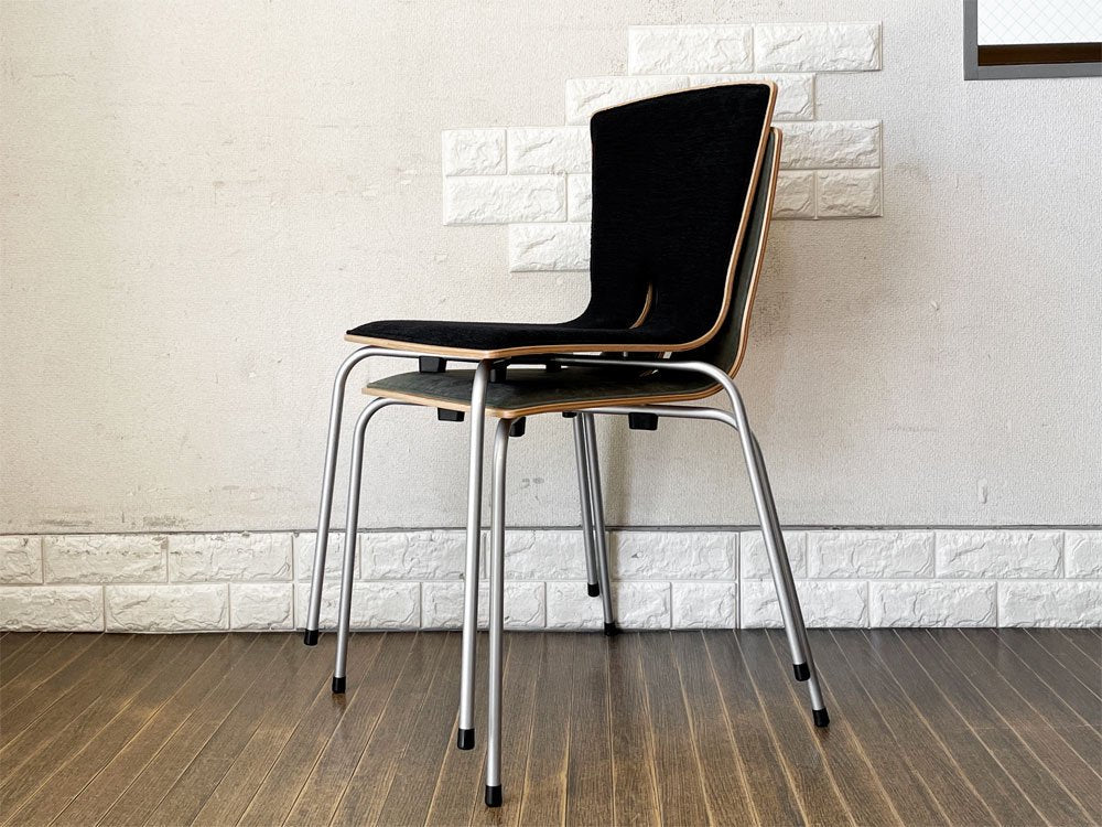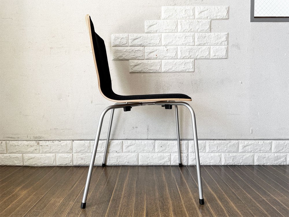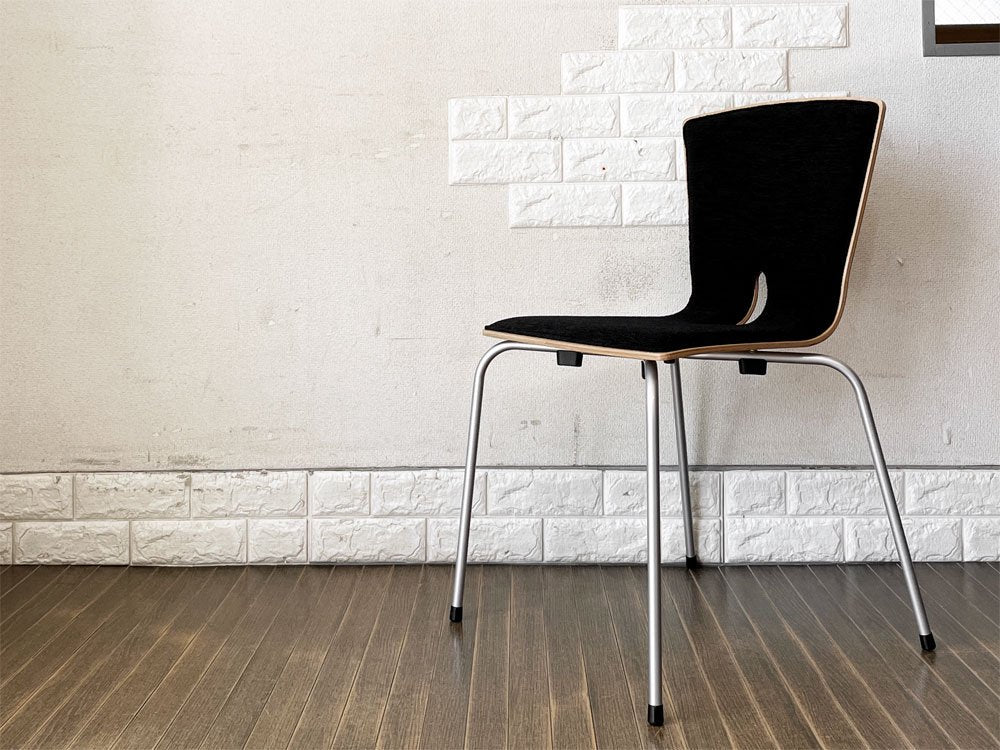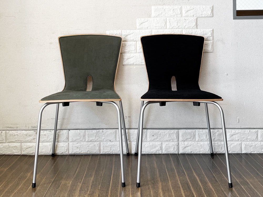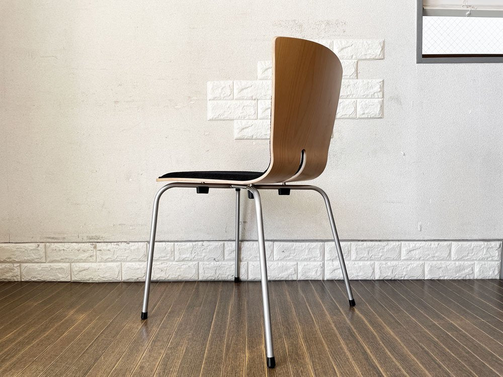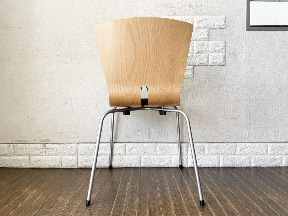こちらは、プライウッドの背座にスチール脚を合わせたスタッキングチェア「リーブス | LEAVES」。スマートな佇まいが魅力のダイニングチェアです。