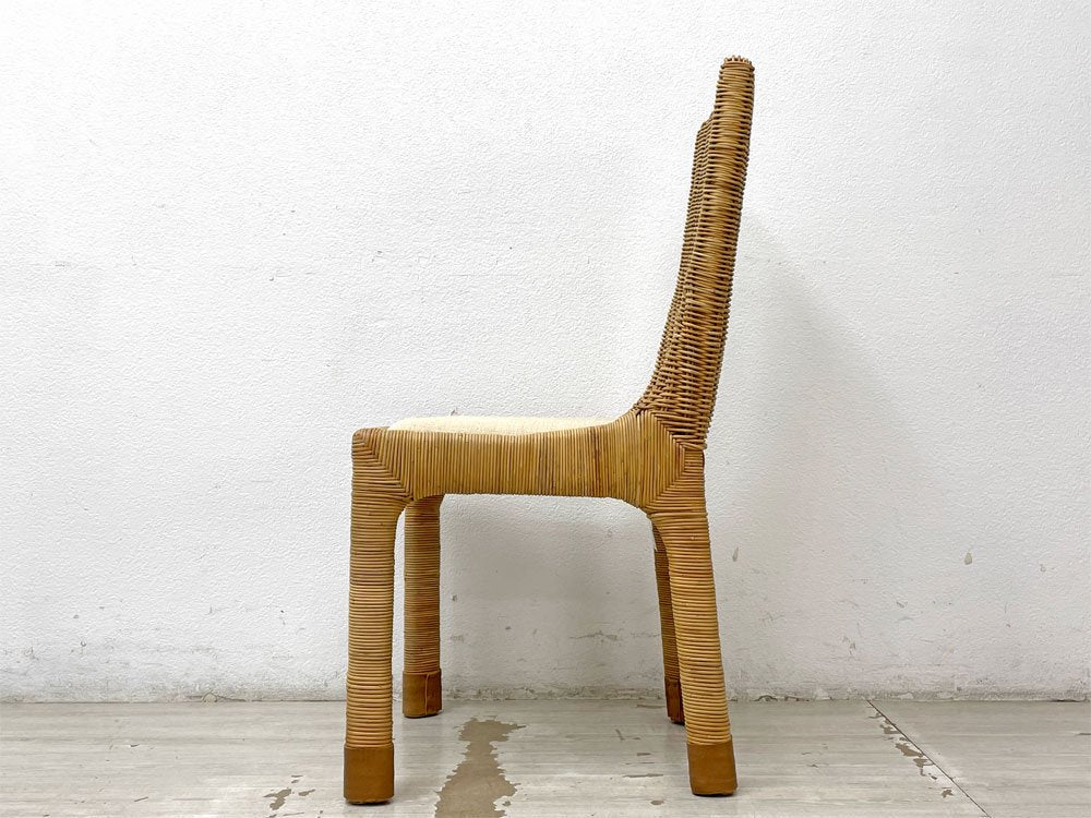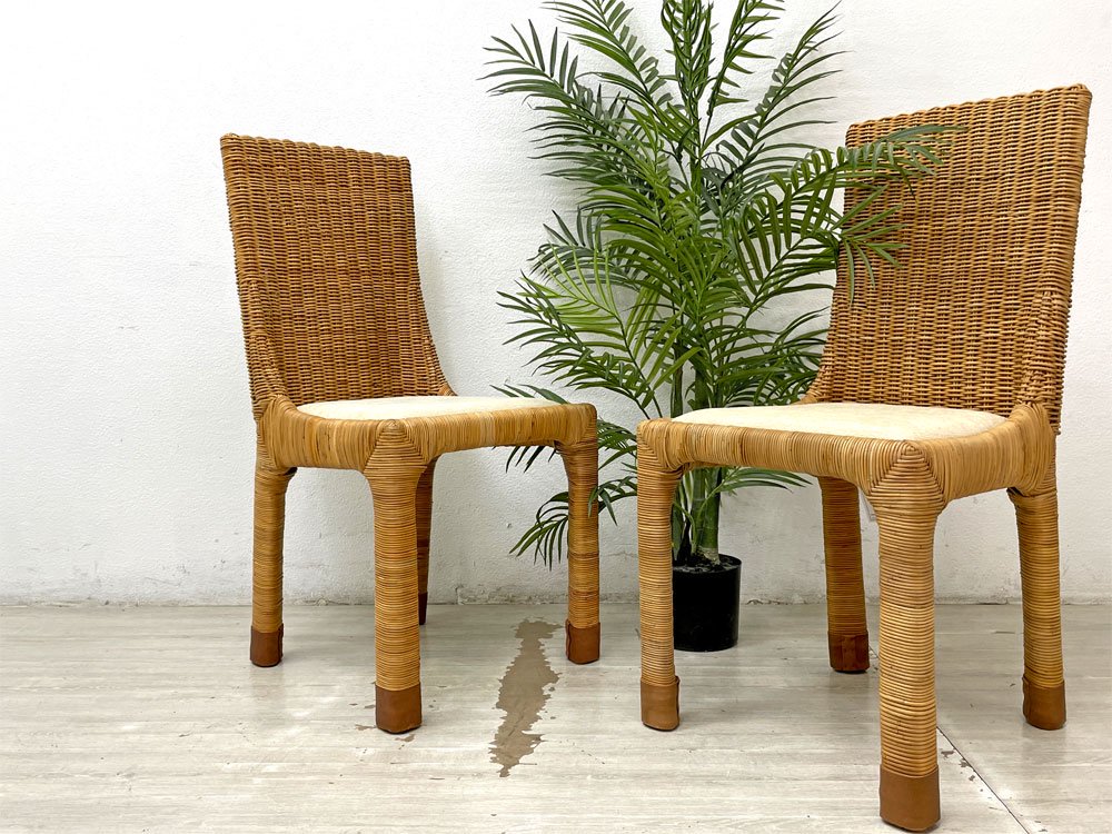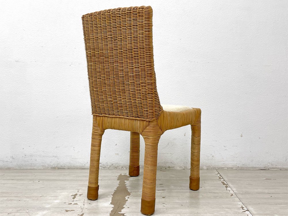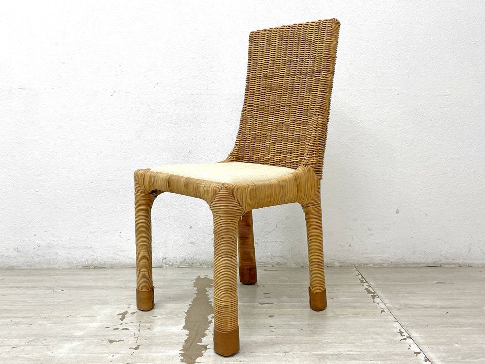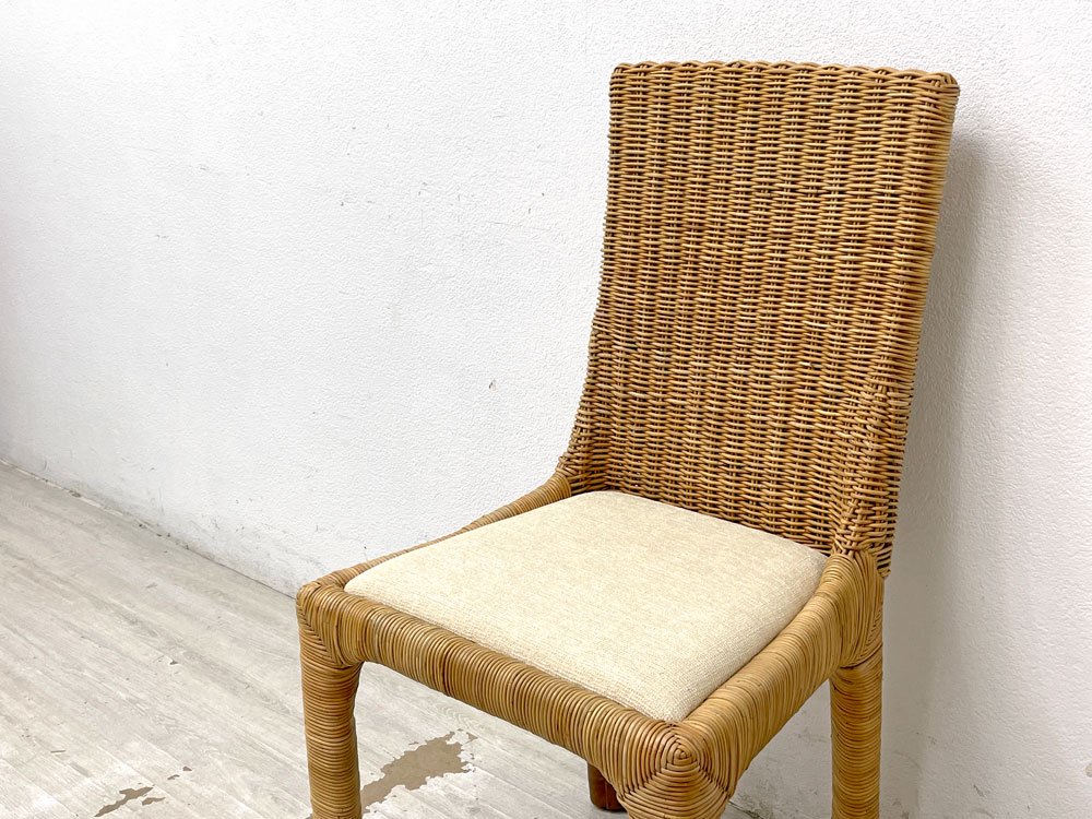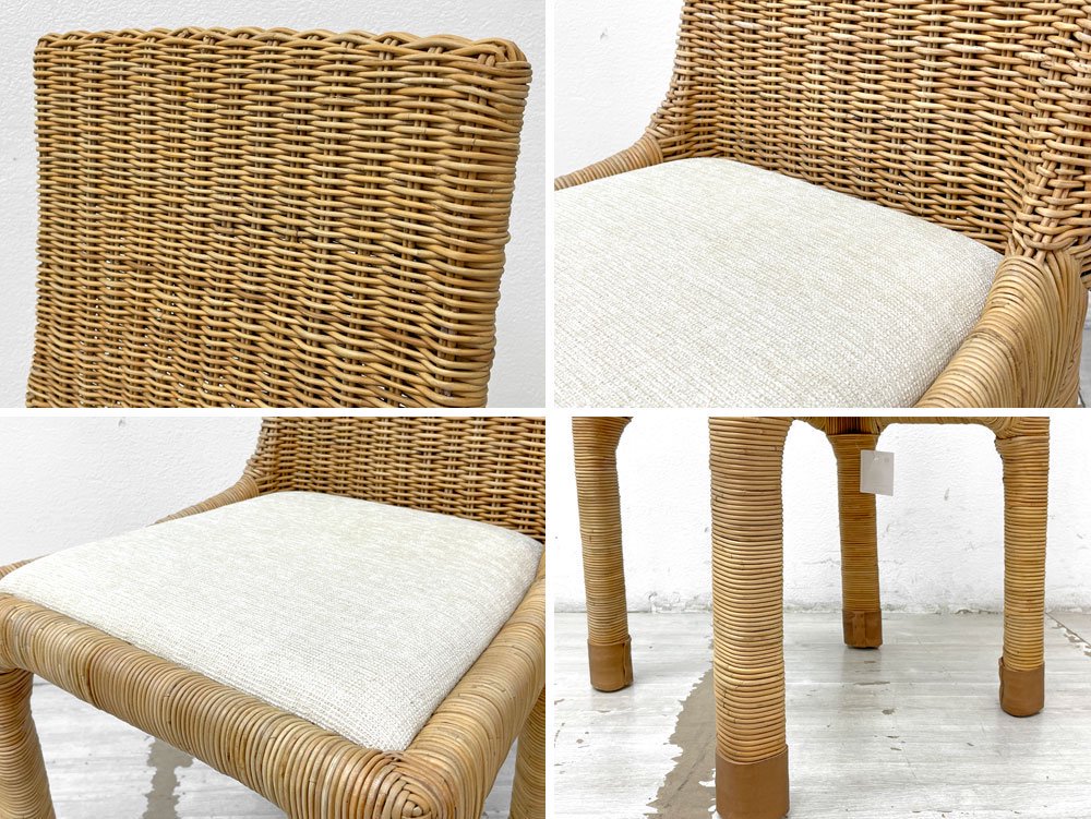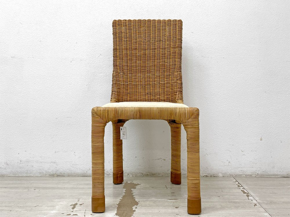 こちらは『 アジアンコンフォート ASIAN COMFORT R-301B サイドチェア 』になります。背もたれから脚部まで自然本来の風合いを感じられるラタン素材を使用し、丁寧に編み込まれたダイニングチェア。シンプルなフォルム故にその表情がより力強く引き立ちます。また座面や脚先には異素材がミックスされ、質感と色合いの違いにより美しいコントラストが生まれています。