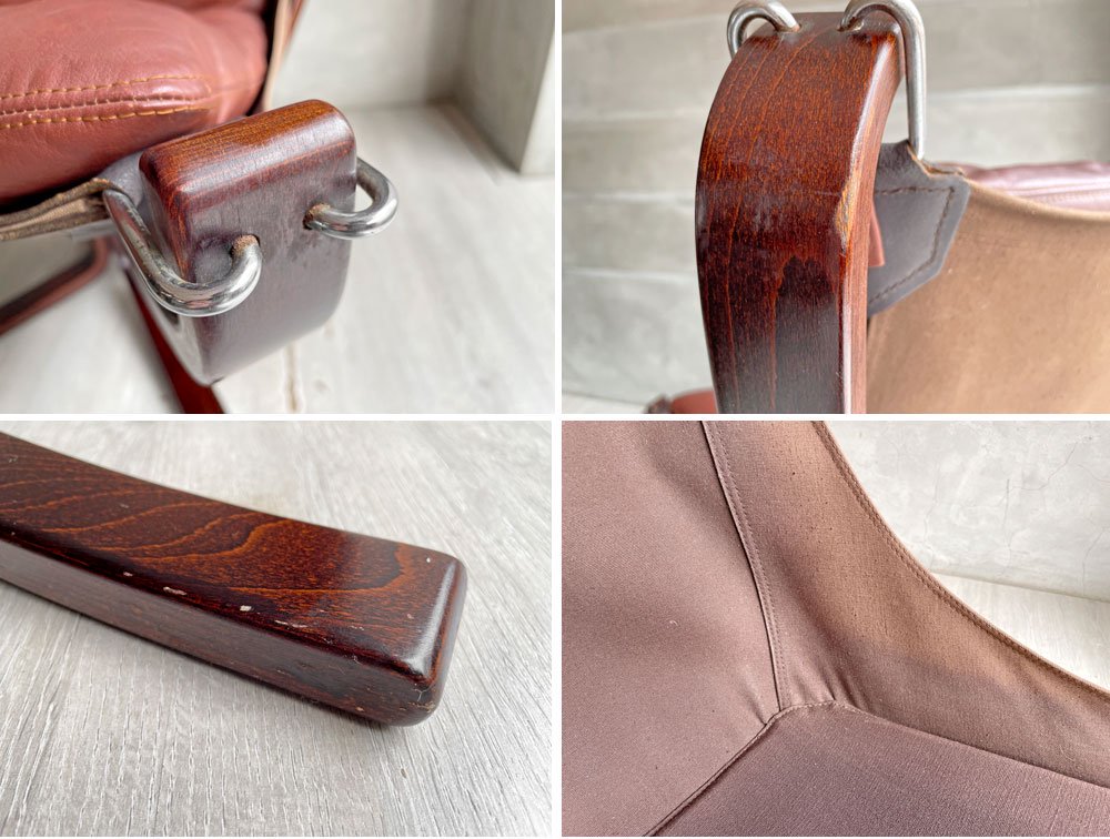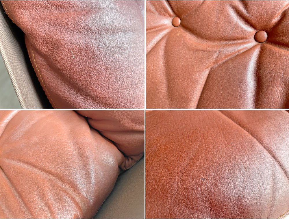 レザーにくすみや擦り傷、フレームに細かな打痕や擦り傷、金具に落としきれないサビやくすみ、ファブリックの色褪せといった、経年なりの使用感が散見されます。しかしながら、通常使用に支障を来すような不具合はなく、古いお品物ながら十分実用可能なコンディションを保っております。