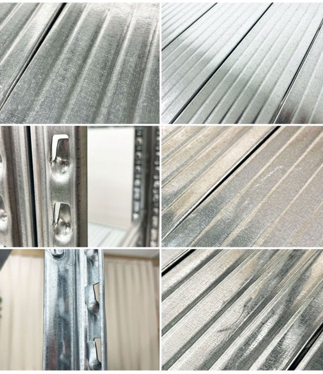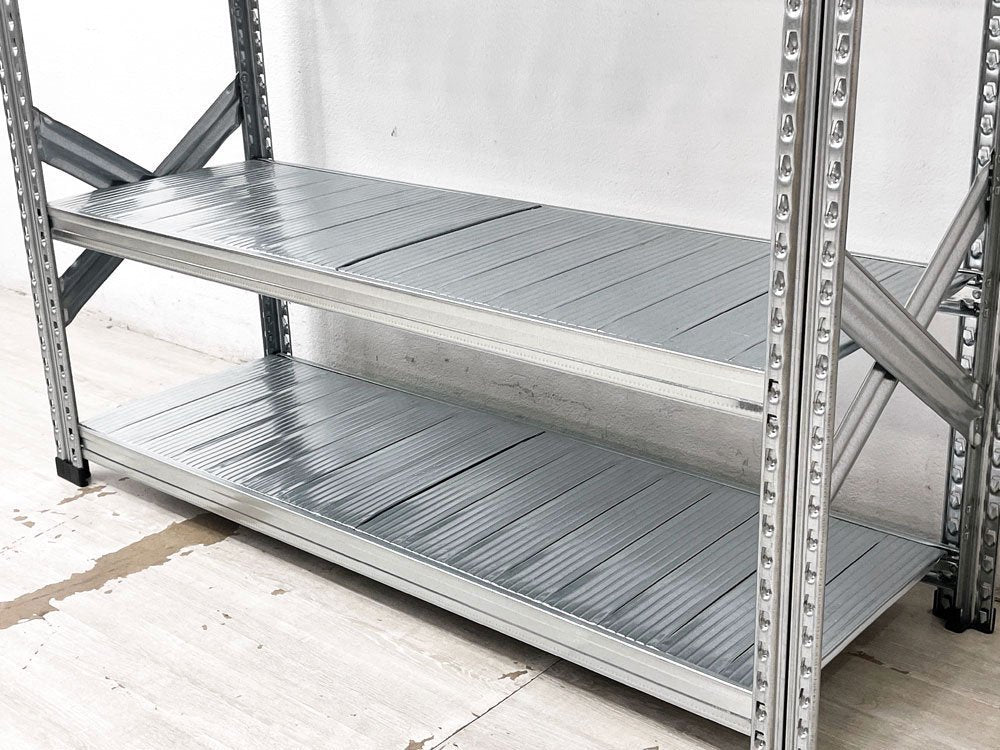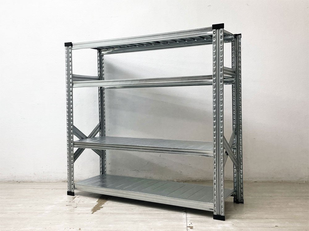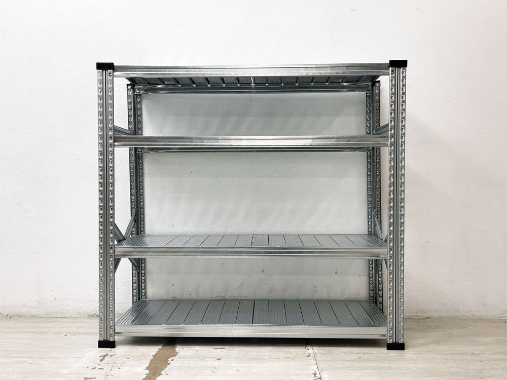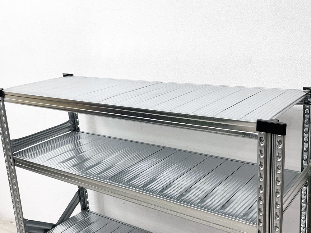 亜鉛メッキ製のスチールフレームを使用し、ボルト等を使用せずに組み立てが可能。見た目と異なり、非常に軽量なのも嬉しいポイントです!独自のリブ加工により150kgの耐荷重を実現。本棚、飾り棚、収納棚等、様々な用途で活用頂けます。