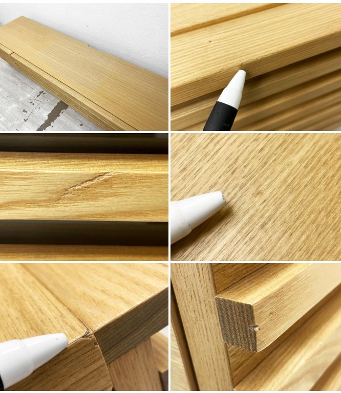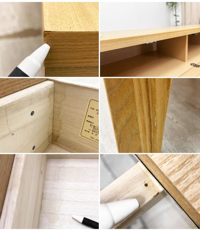 使用に伴い、全体に僅かな擦れや線傷、打痕、縁の欠けなどがございます。また、天板にはテレビが置かれていたことによってできた日焼けや薄っすらとした輪染み、抽斗内部に染みが見受けられます。その他取り切れない汚れ等がございますが使用上問題となる大きなダメージはございません。これからも安心して実用いただけるコンディションを保っています。