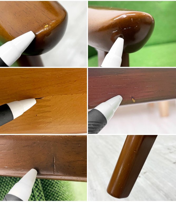 使用に伴い、フレームには線傷や打痕、レタッチ跡などが見受けられます。また、ファブリックにはシミや擦れ、僅かな毛羽立ちが見受けられますが使用上問題となる大きなダメージはございません。これからも気持ち良く実用頂けるコンディションを保っております。