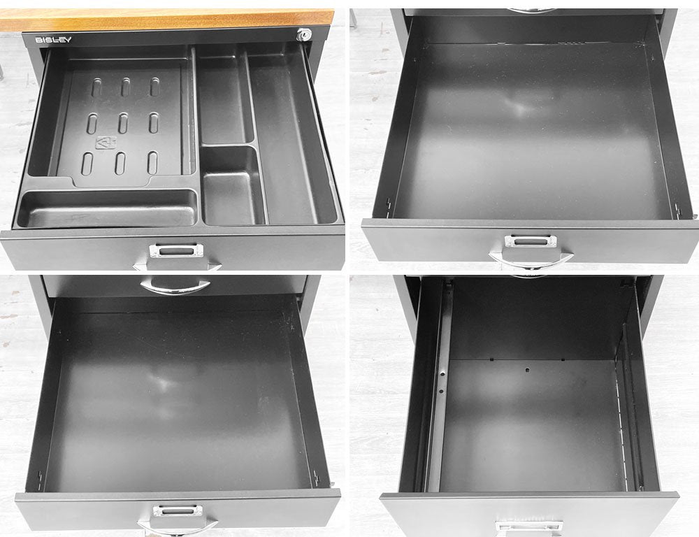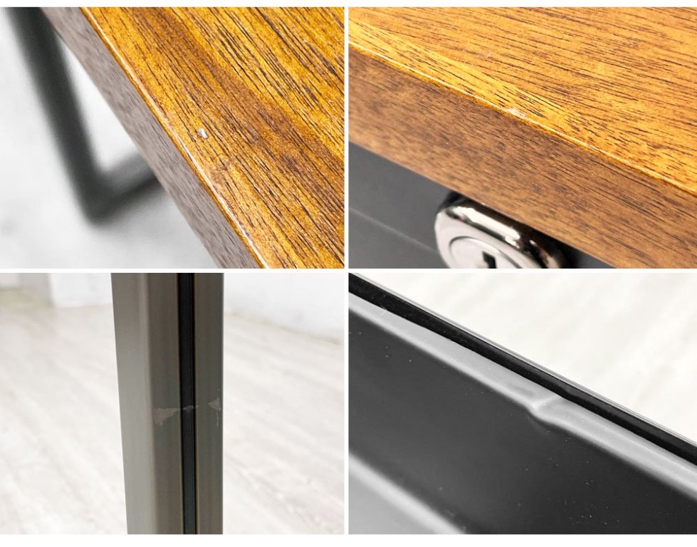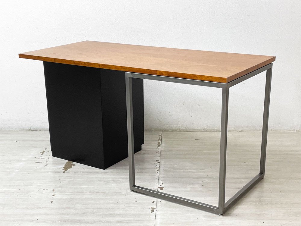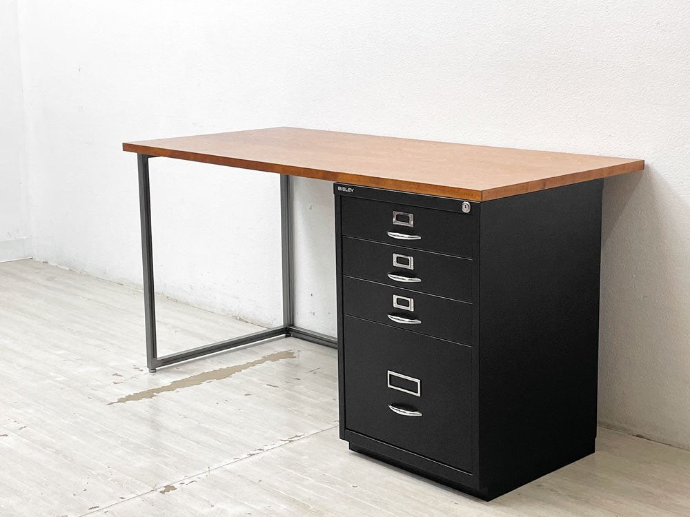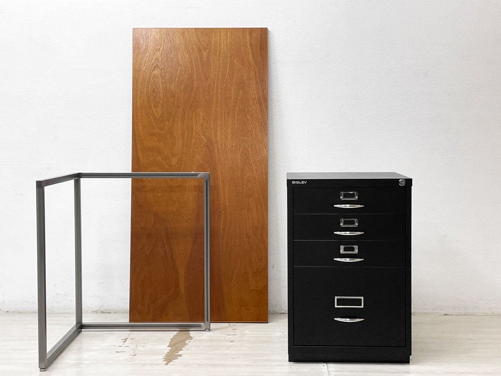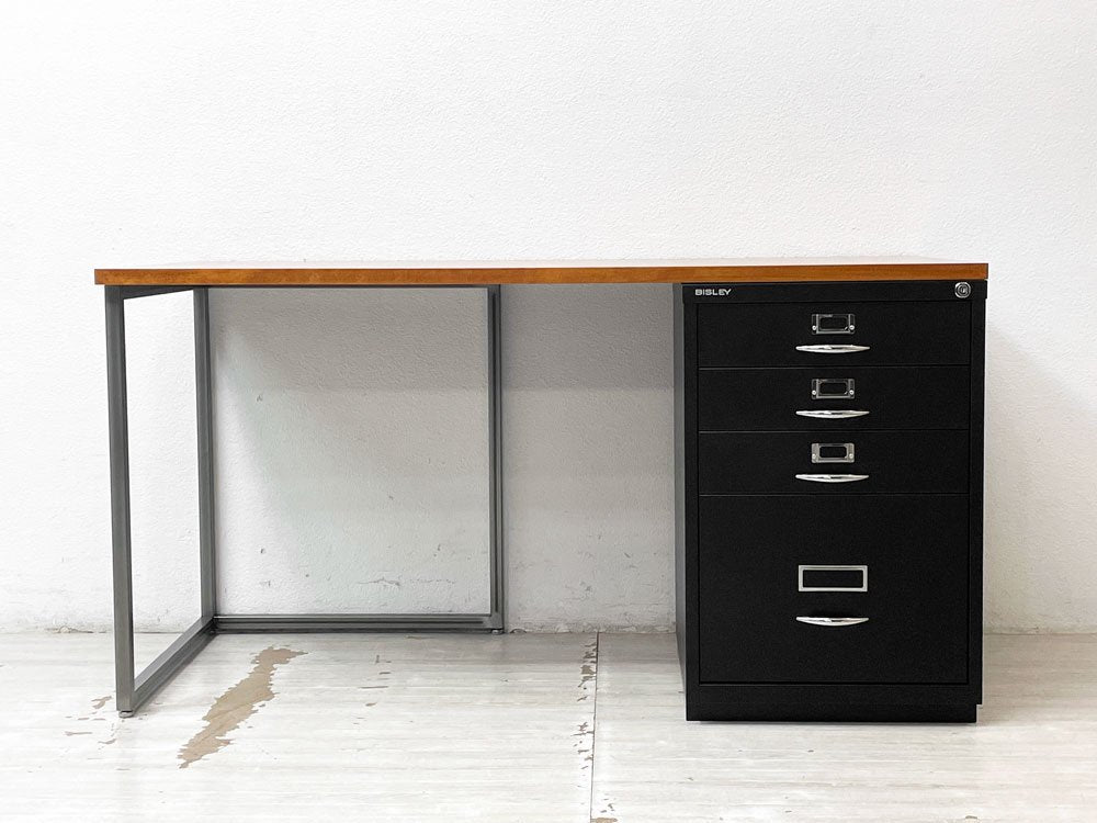 天板はバーチ材を使用した風合いのいい物を作り、それに合わせL型分割式のスチールレッグ、"ビスレー BISLEY"社のキャビネットを組み合わせたオリジナルのプロダクトとなっております。