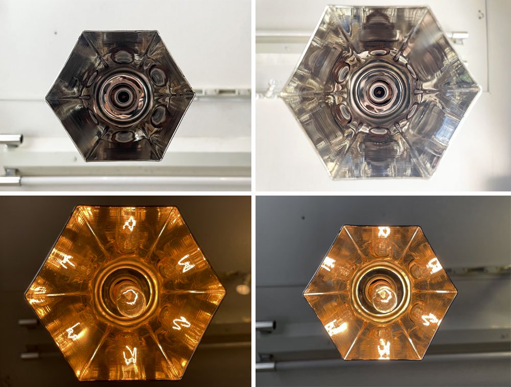 点灯時には電球のフィラメントがぼんやりと透けて見え、不思議な感覚を味わうことができます。また、消灯時には六角形のシェードが星のオブジェのように静かに佇みます。