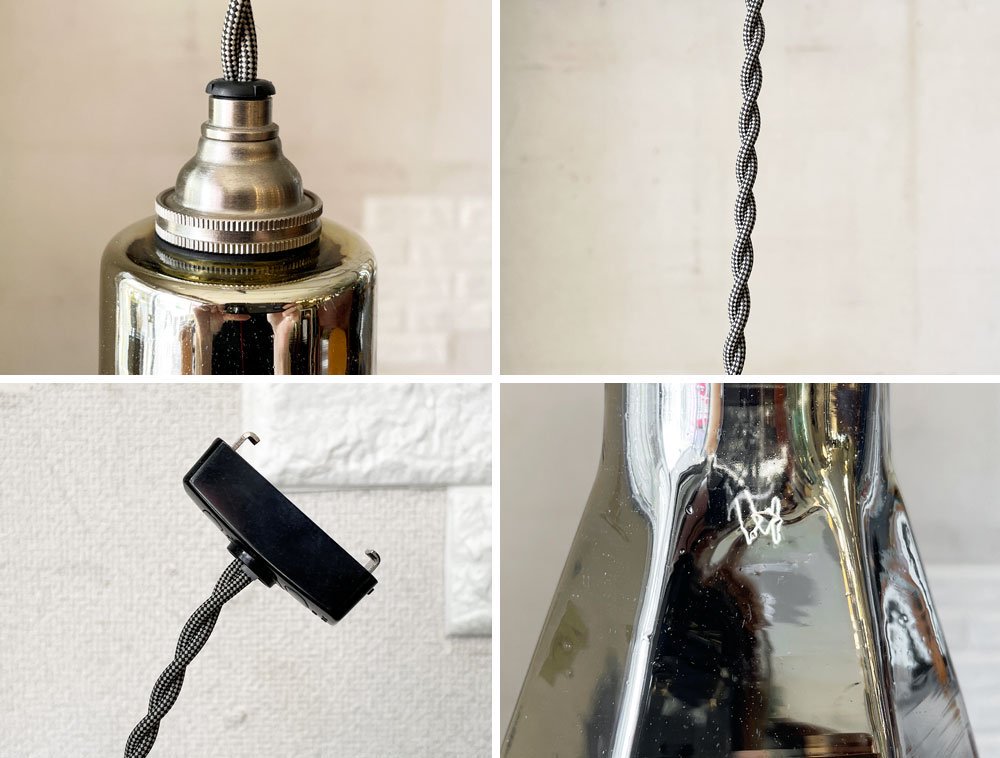 シェードには、水銀塗装のムラや気泡などの製造痕が見受けられるほか、若干の擦れや傷、縁のペイントロスがございます。また、シェード上部のみやや黄色味が感じられますが、経年の変化としてお楽しみいただける程度かと思われます。なお、電球が1本付属しますが未使用ではないため寿命は分かりかねます。おまけとしてお考え下さいませ。その他、コードの歪みはございますがご使用に問題となるダメージはございません。