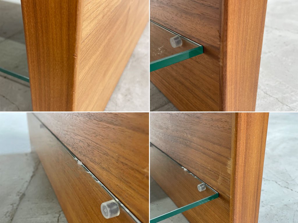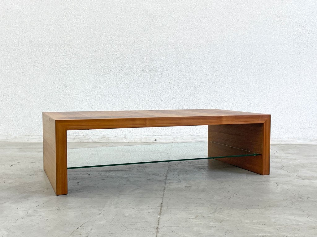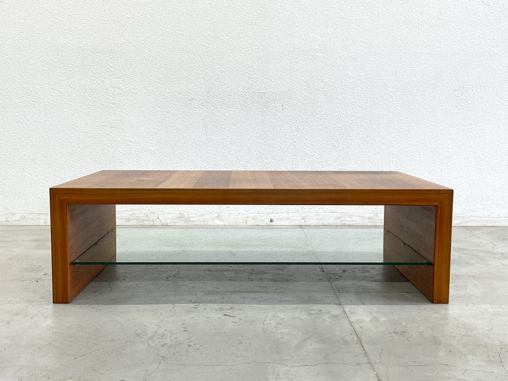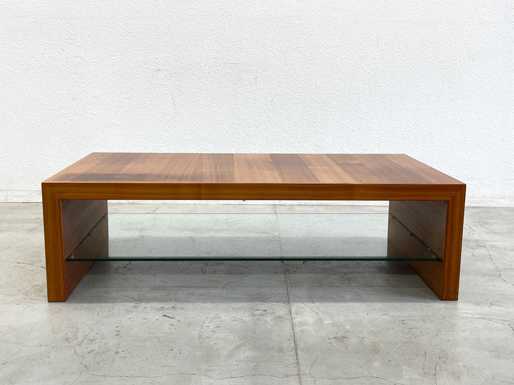 線形の木目を基調とした美観はスタイリッシュさが際立ち、ガラスのシェルフボードという珍しい組み合わせのセンターテーブル。