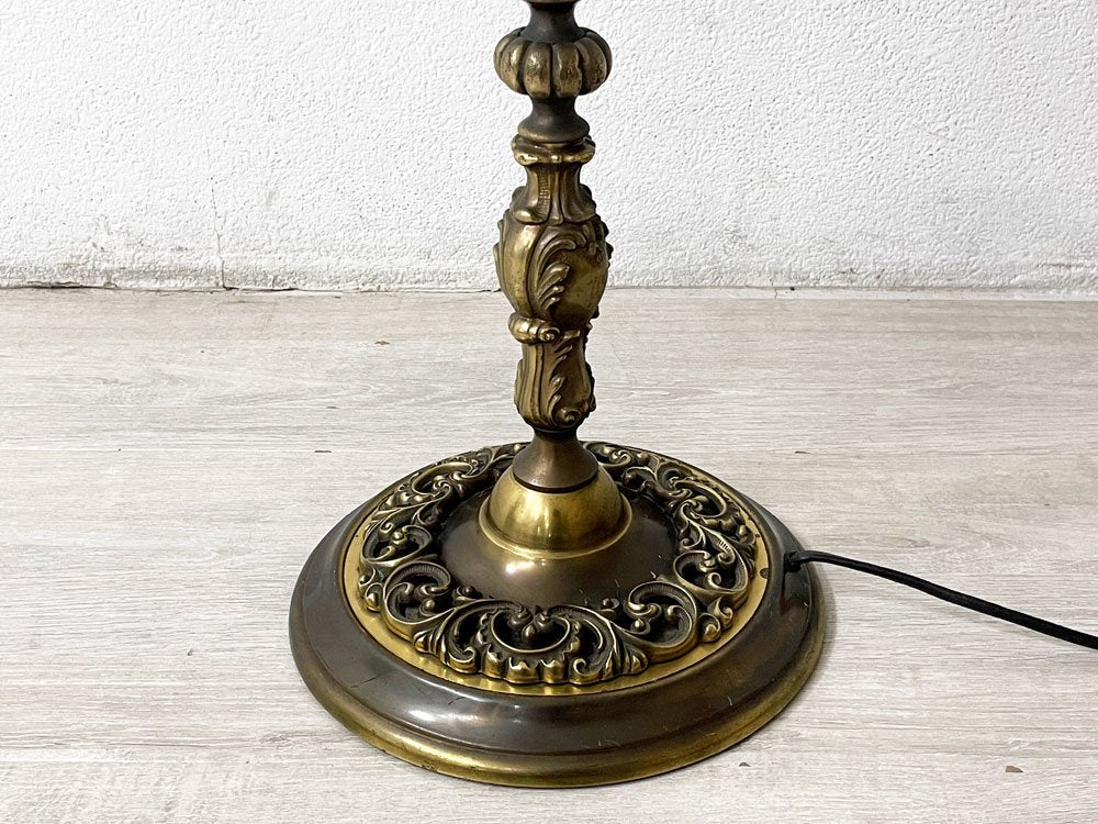ボリュームがあり刺繍が施されたシェードと、植物のレリーフが施されたベース、それらを繋ぐすらりと伸びた支柱の組み合わせで、全体的にバランスの良い仕上がり。