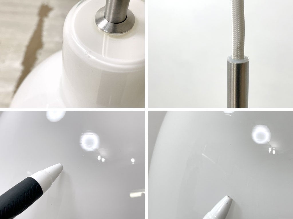 ポール・ヘニングセンがデザインした楕円形リフレクターをモチーフに作られた直径22cmのガラス製のシェードは、内面フロスト仕上げの3層ガラス構造。下方を重点的に照らし、上方にもガラスを透過し柔らかく広がる光が空間を演出します。ステンレスヘアライン仕上げのパイプも異素材の組み合わせによりアクセントとなり、都会的な雰囲気を醸し出しています。