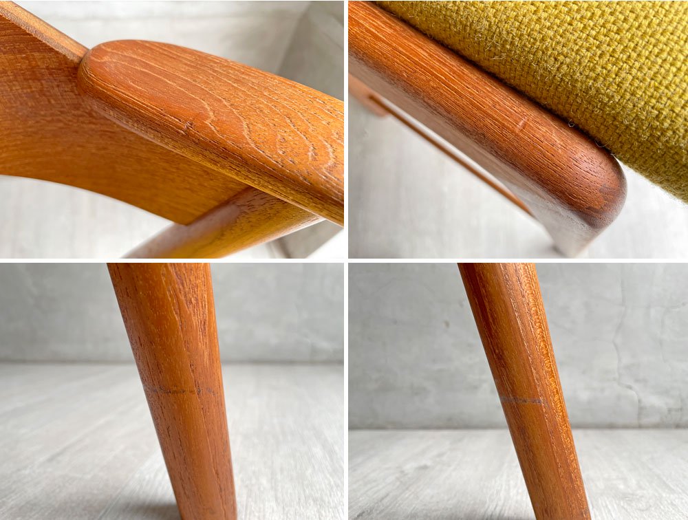 当店入荷後にサンディング、オイルの塗布、ファブリックの張り替えを行っております。細かな打痕や擦り傷が見られる程度で、極端に美観を損なうようなダメージの見られない、比較的良好なコンディションとなります。