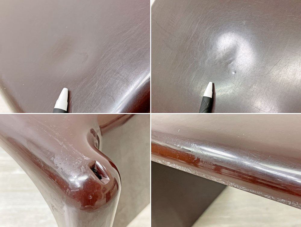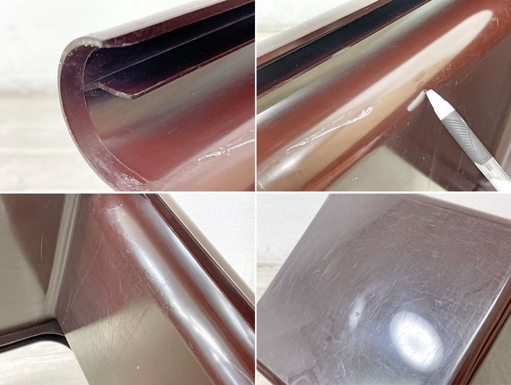 こちらはビンテージ品となります。使用に伴う擦れ傷の他、スクラッチや線傷、着色、天板には2箇所薄っすらとした凹み、スタッキング時に嵌合する爪に1か所欠け等やや使用感がございます。ほかスタッキングの上下によってはわずかに隙間が感じられる場合がございますが、実用に大きく影響するものではございません。年数相応の使用感はございますが亀裂や割れなど大きなダメージは無く、引き続き雰囲気を楽しみながらご実用頂けるコンディションを保っております。