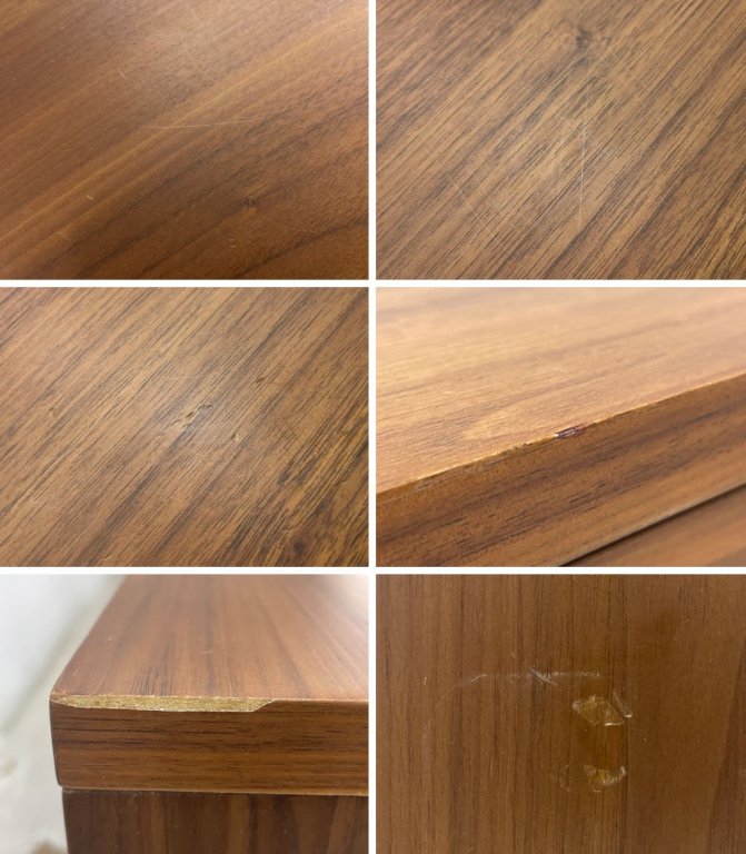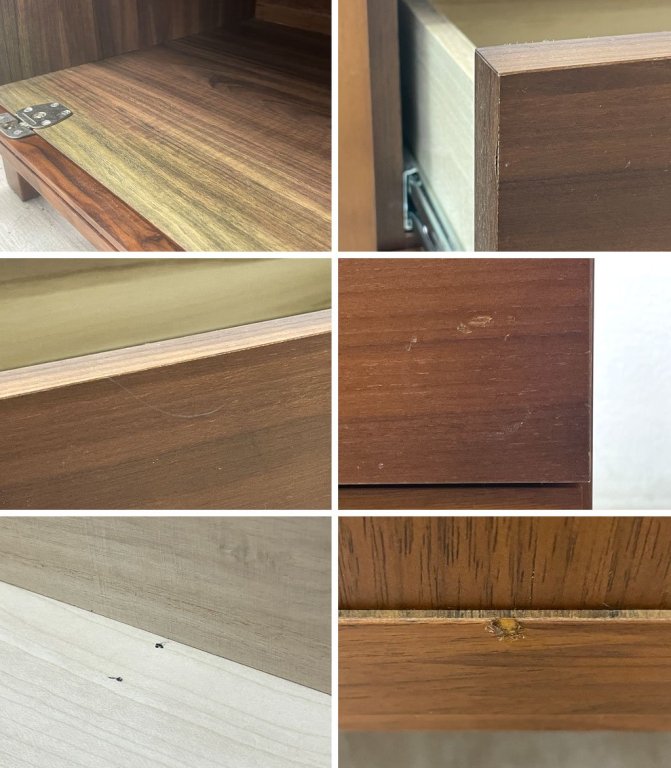 使用に伴い天板に細かな擦れや線傷、縁に打痕や突板の欠け、フラップ扉内部に日焼けによる色褪せが見受けられます。その他、ガラス扉に糊の劣化によるフィルムの僅かな浮きが生じているなど、やや使用感のあるコンディションではあるものの、ご使用に問題となるような不具合はございません。これからも充分実用頂けるコンディションを保っております。