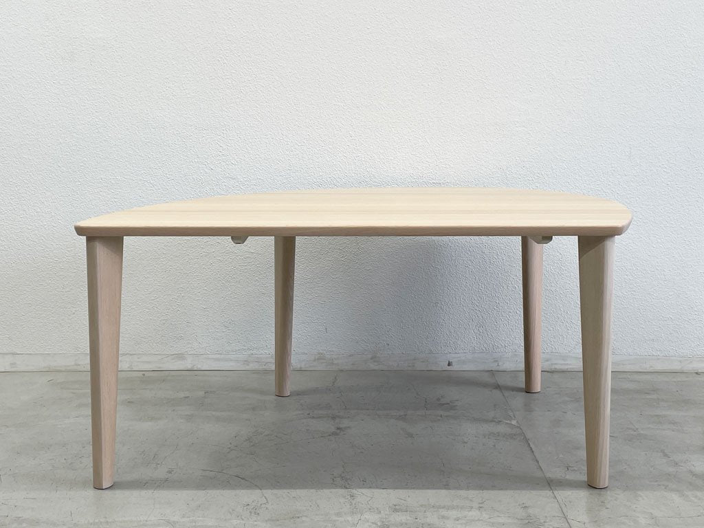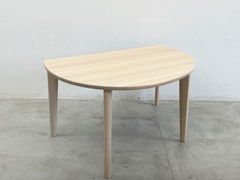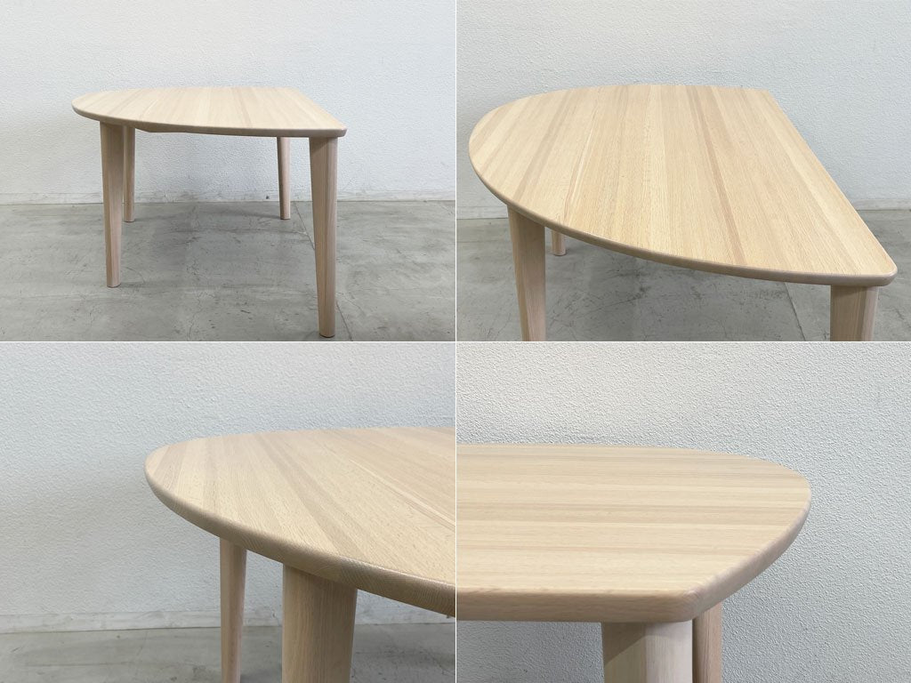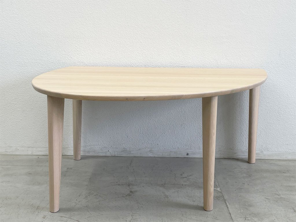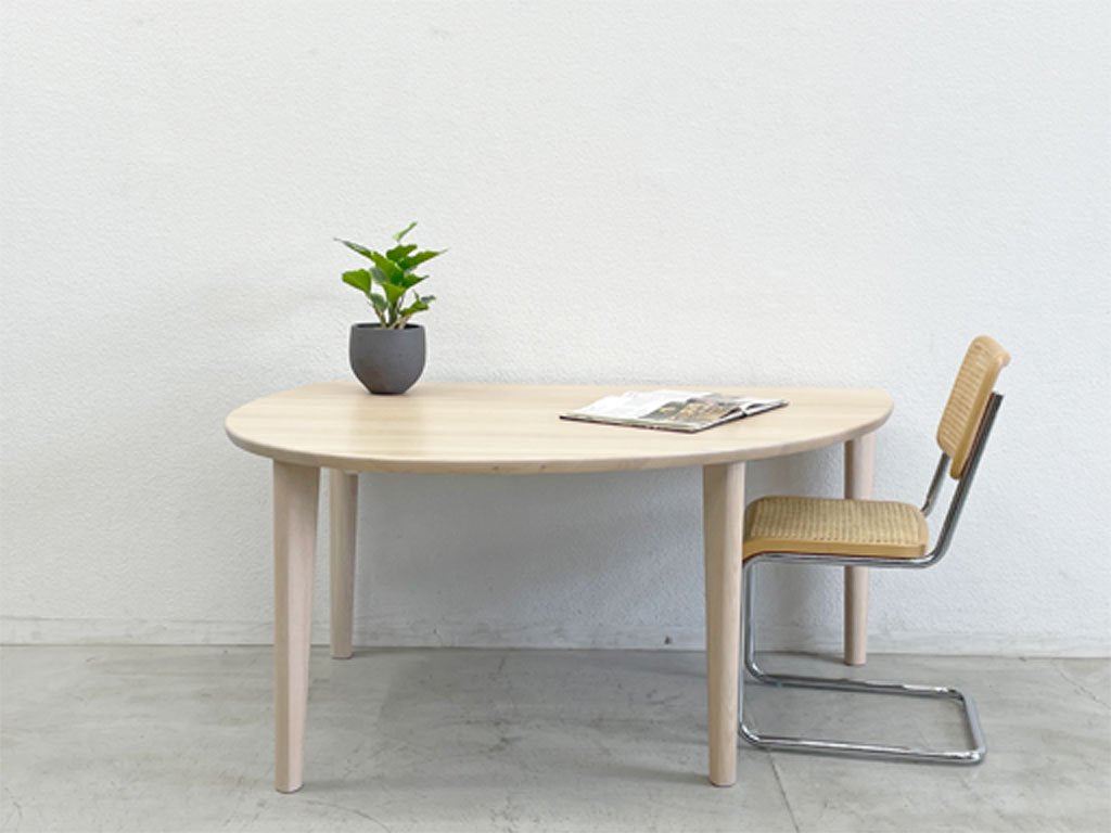 柔らかな印象を与えるラウンドと直線を一か所持たせる事で用途に幅を持たせた瀟洒なデザインテーブル。