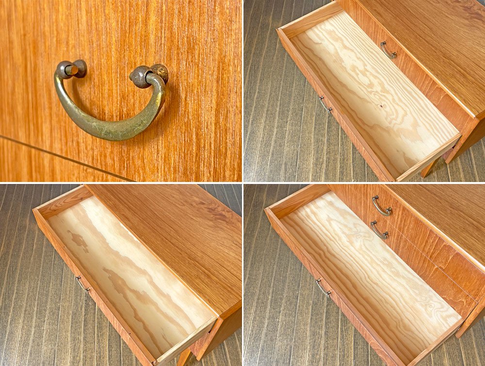 3杯あるドロワーの戸板にはひとつながりの木目を楽しめるチークをあしらい、把手には経年の変化が顕著なブラス(真鍮)。
