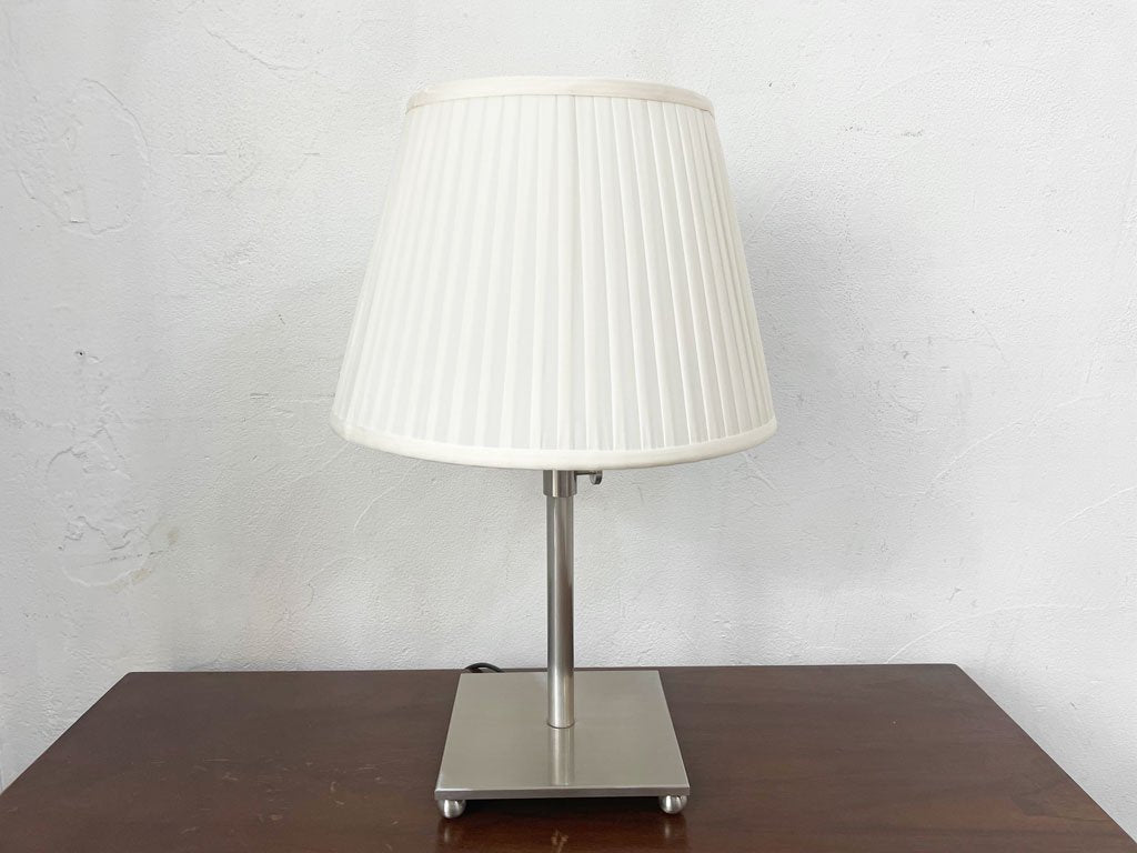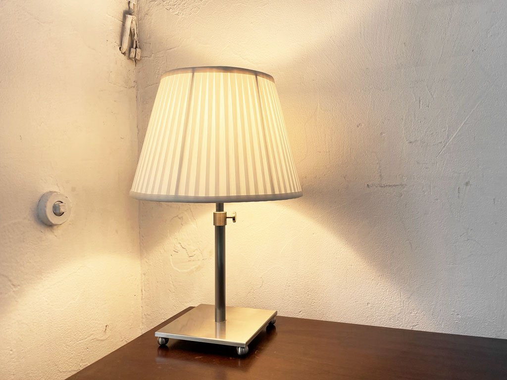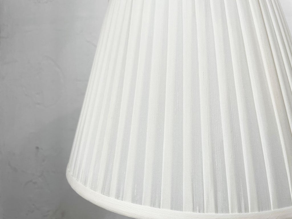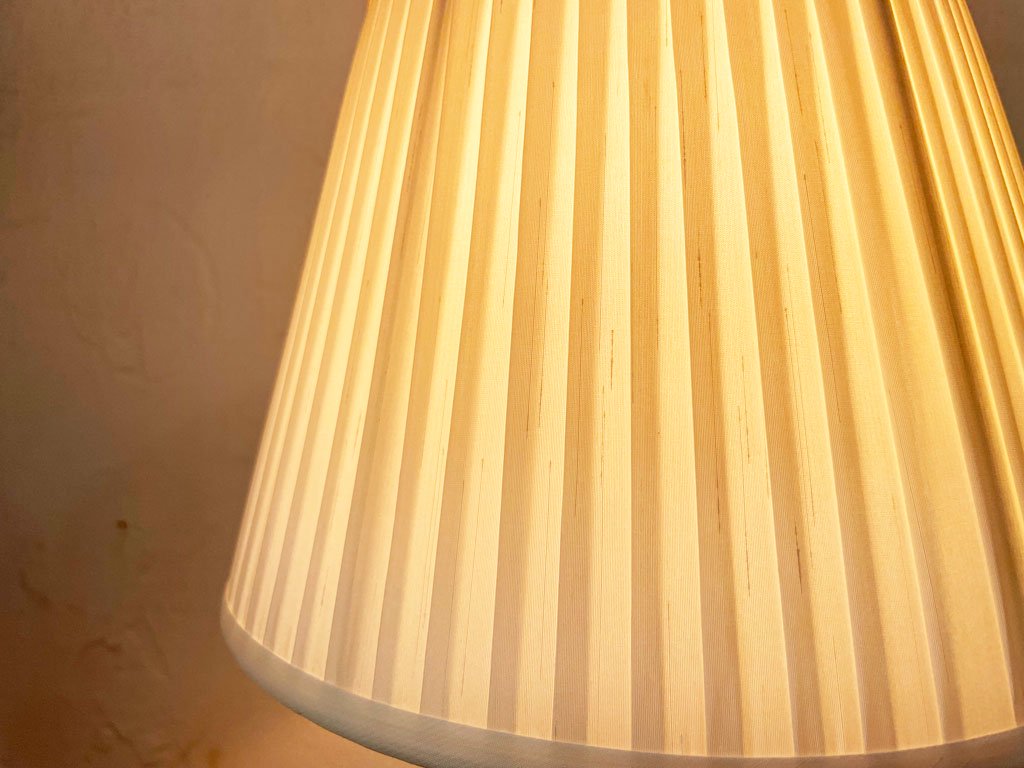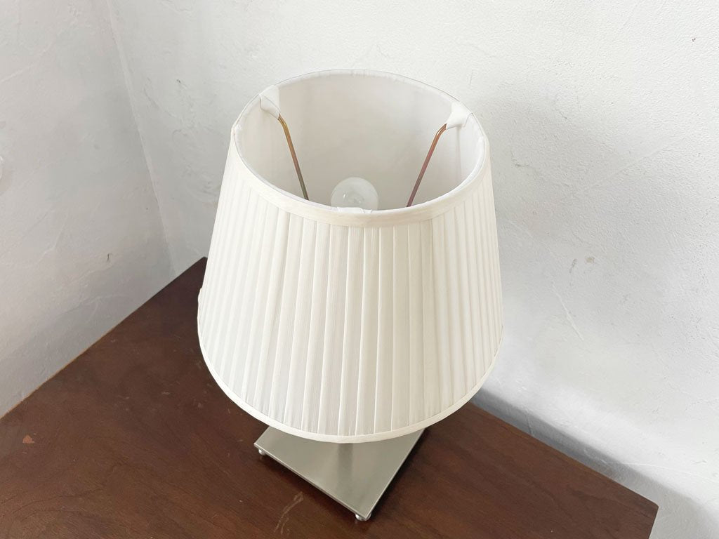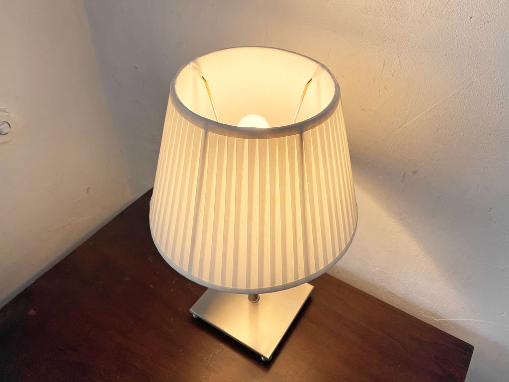 上品なプリーツのあしらわれたシェードとシルバーのベースの組み合わせの、小振りなテーブルランプ。
