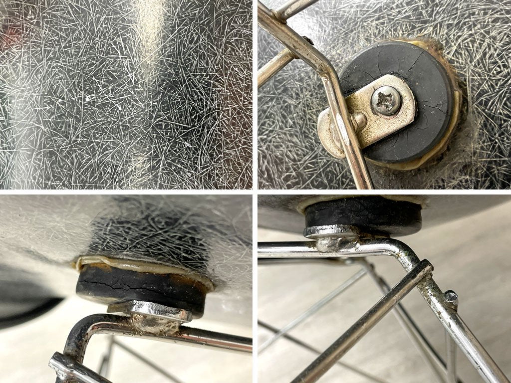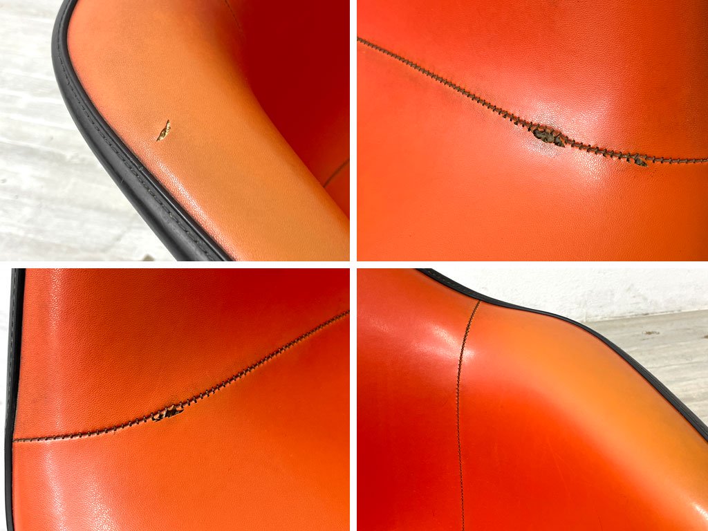 こちらはビンテージ品となります。経年に伴う擦れや小傷、金属部分のくすみや錆付きなどが散見されます。またナウガレザーの端部や座面等が日焼けによる退色、3カ所ほどやや大き目の破れが見受けられます。またマウント部分が経年によるクラックや補修痕などがございますが、着座には特に現状問題はございません。
