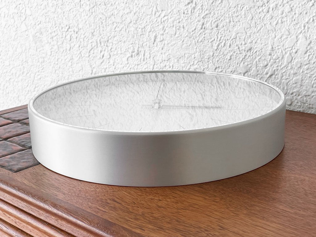 マットな輝きのアルミ製フレームにはやや厚みが持たされており、シンプルながらに存在感のあるウォールクロックです。