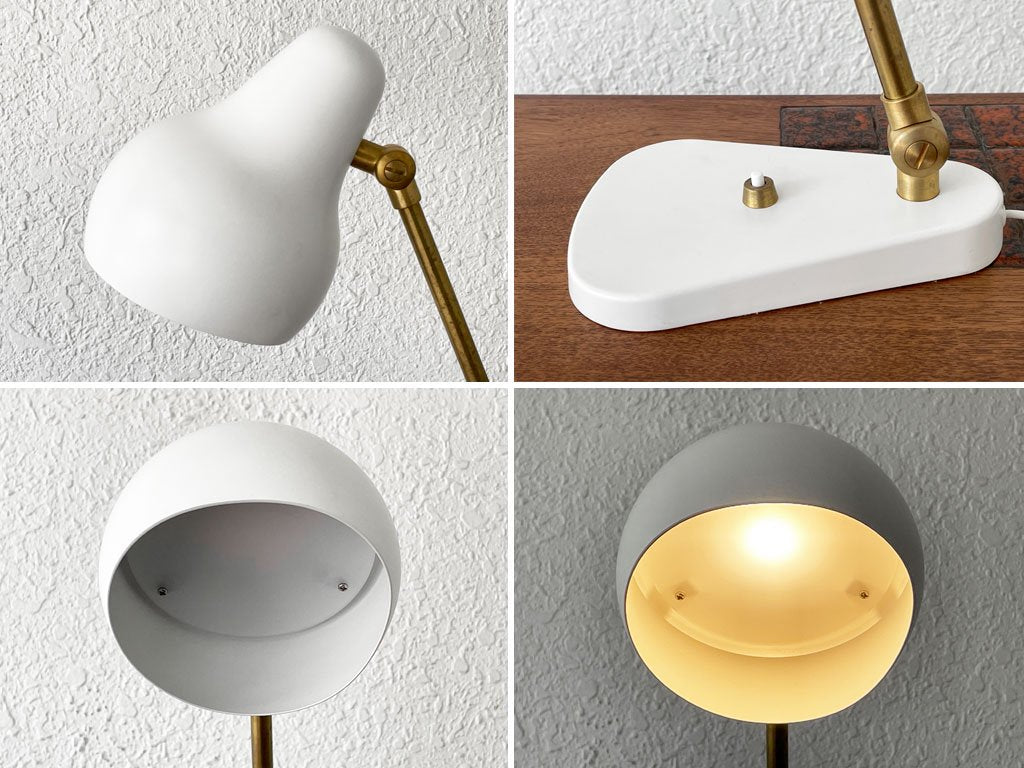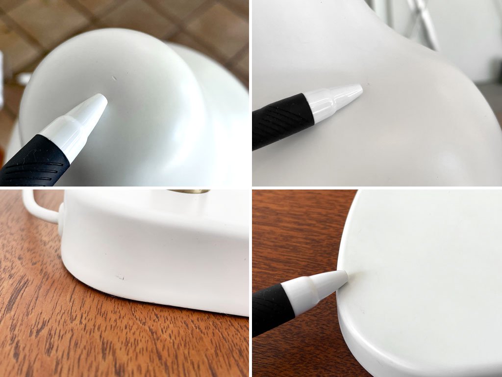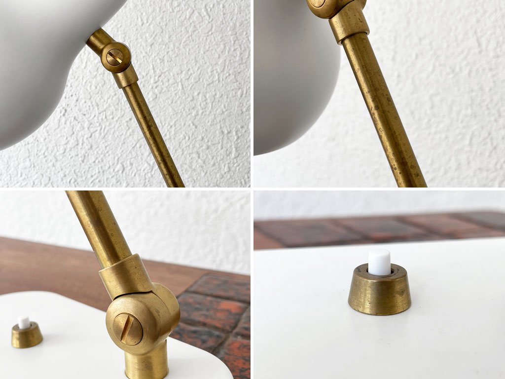使用に伴いシェードに微細な打痕が一か所、その他極僅かな擦れと着色が見られますが、目立つダメージはございません。アーム、ボタン等の真鍮にはくすみと細かな傷が見られますが、素材特有の味としてお楽しみ頂けます。動作に問題も無く、概ね良好なコンディションを保っております。