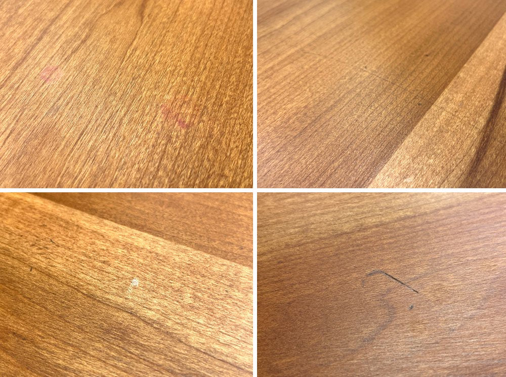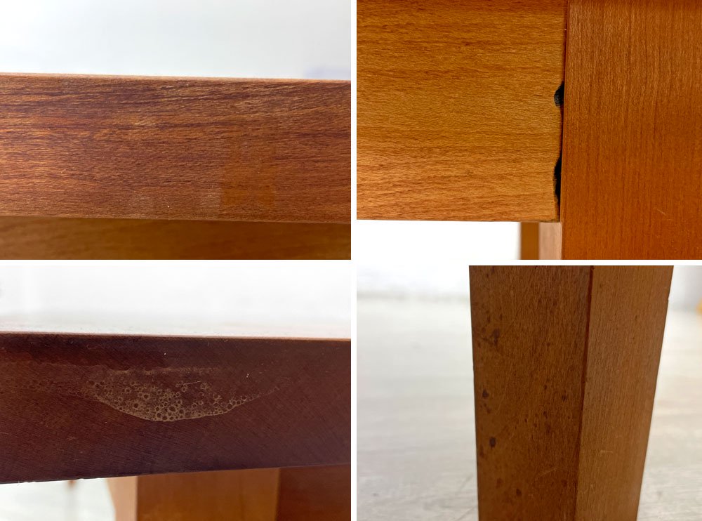 使用に伴うすれや傷、軽微な打痕、色焼けがございます。また、天板と脚部の接している箇所に僅かな隙間が見受けられますが、グラつきや強度に問題なく、これからも安心して実用頂けるコンディションを保っております。