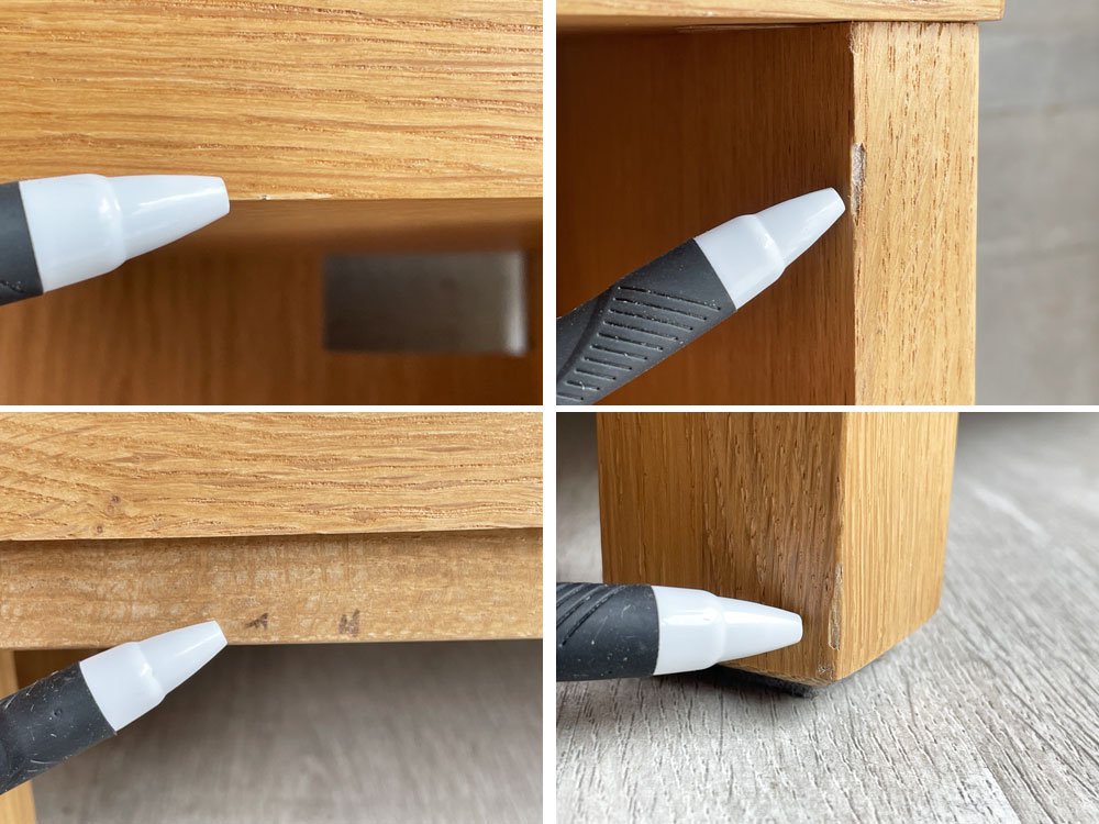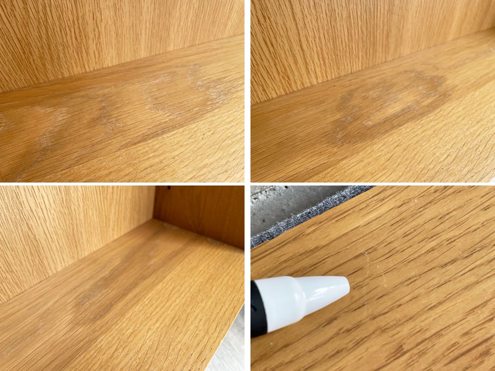 細かな打痕や薄染み、色移り、わずかな突板の剥がれが散見されるものの、木材のヒビ割れなどの大きなダメージは無く、これからも実用頂けるコンディションを保っております。