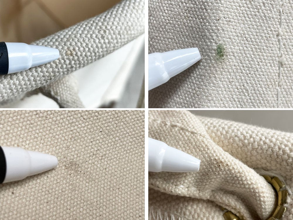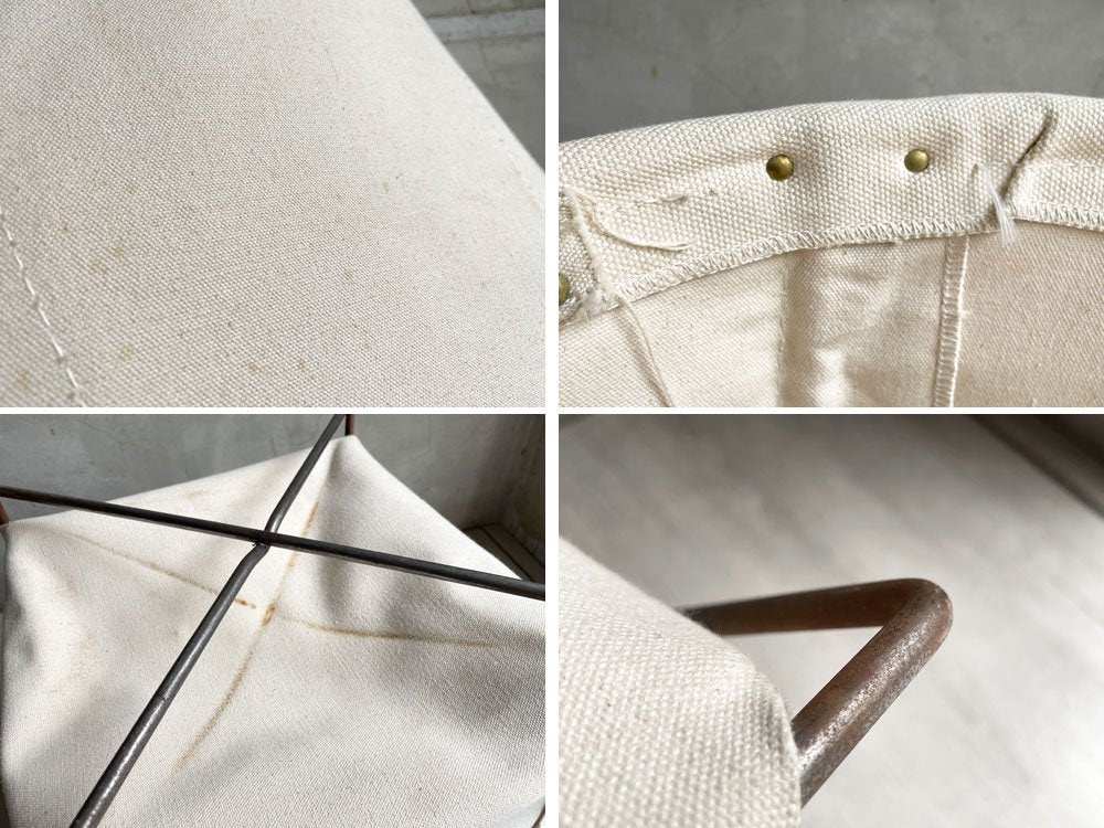使用に伴う縫製のほつれ、色移りが見られるほか、キャンバス地に薄染みが散見されます。また、スチールフレームは錆びがやや目立ちますが、その他生地の破れやフレームの破損など大きなダメージは無く、これからも実用頂けるコンディションを保っています。