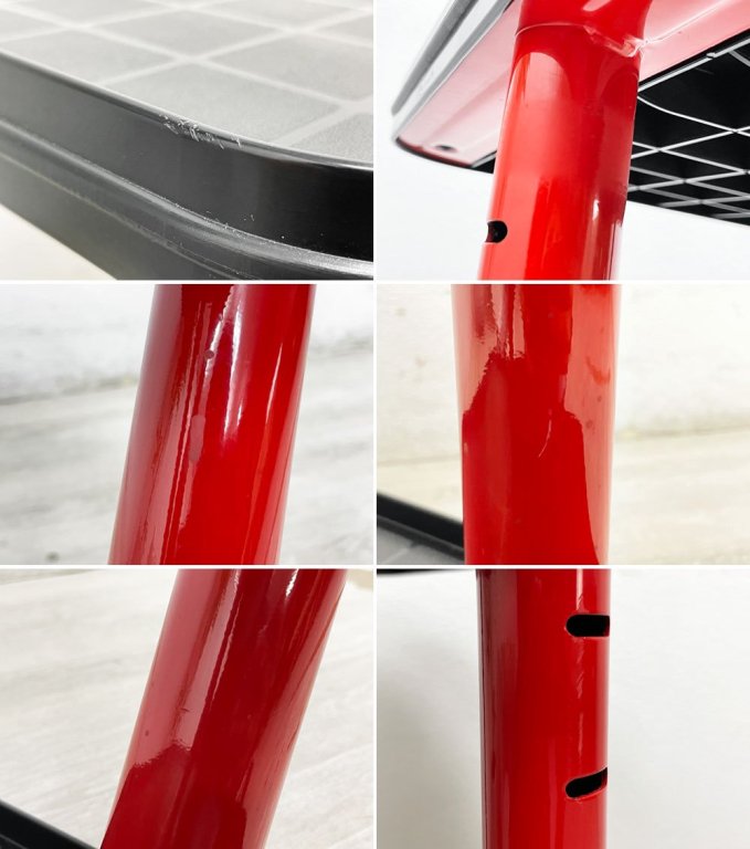 使用に伴う擦れや小傷、くすみ、落としきれない汚れが全体に見られます。また高さ調節をする際にやや引っ掛かりが感じられますが、天板を水平に保ちながら左右の支柱を上下させることで、動かしやすくなります。その他機能に大きく問題となるようなダメージはなく、これからも十分実用いただけるコンディションを保っております。