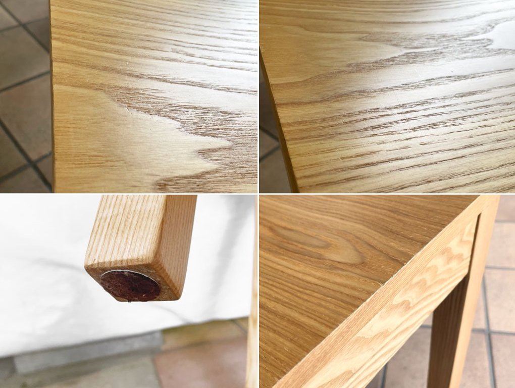 使用に伴い座面に細かな線傷や打痕、角に軽微な突板の剥がれ等が見られますが、大きく美観を損ねるダメージはございません。ガタツキ等使用上問題となる点も無く、概ね良好なコンディションを保っております。