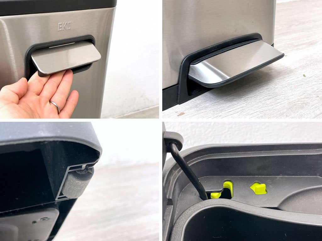 傷や汚れに強く、キッチン周りでも人気の高いステンレス製のごみ箱は、ペダルを踏む事で上部の扉が観音開きに開閉する設計。