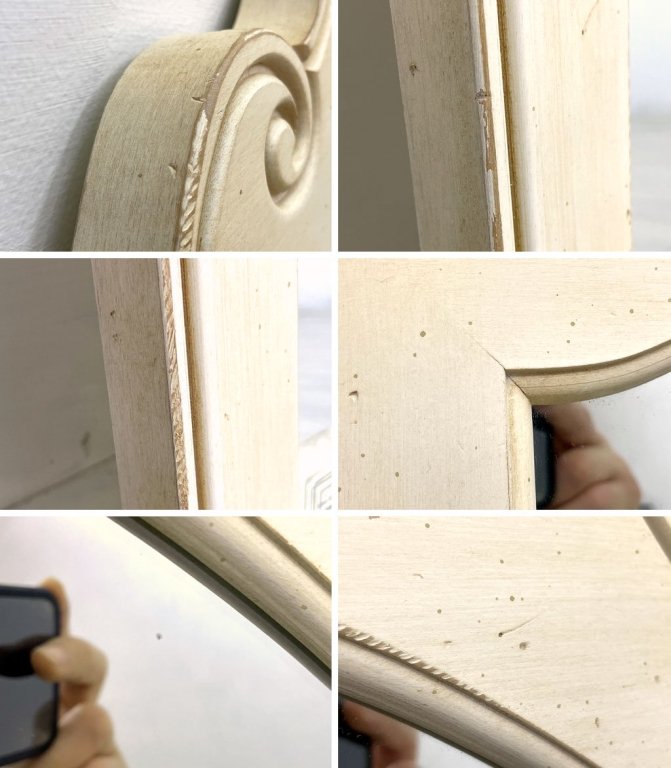 使用に伴う擦れや小傷、打痕やペイントロス、木部の僅かな亀裂などが見受けられます。また鏡面内部に黒いポツが見受けられる箇所などもございますが、ご使用に大きく影響するようなものではありません。元々ビンテージ加工が施されている製品となりますのでそこまで気になるものではないかと思われます。