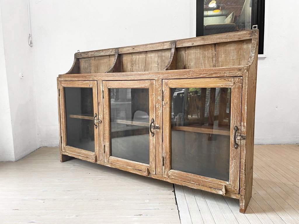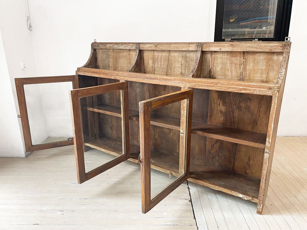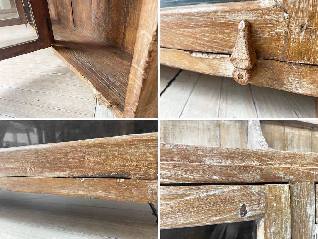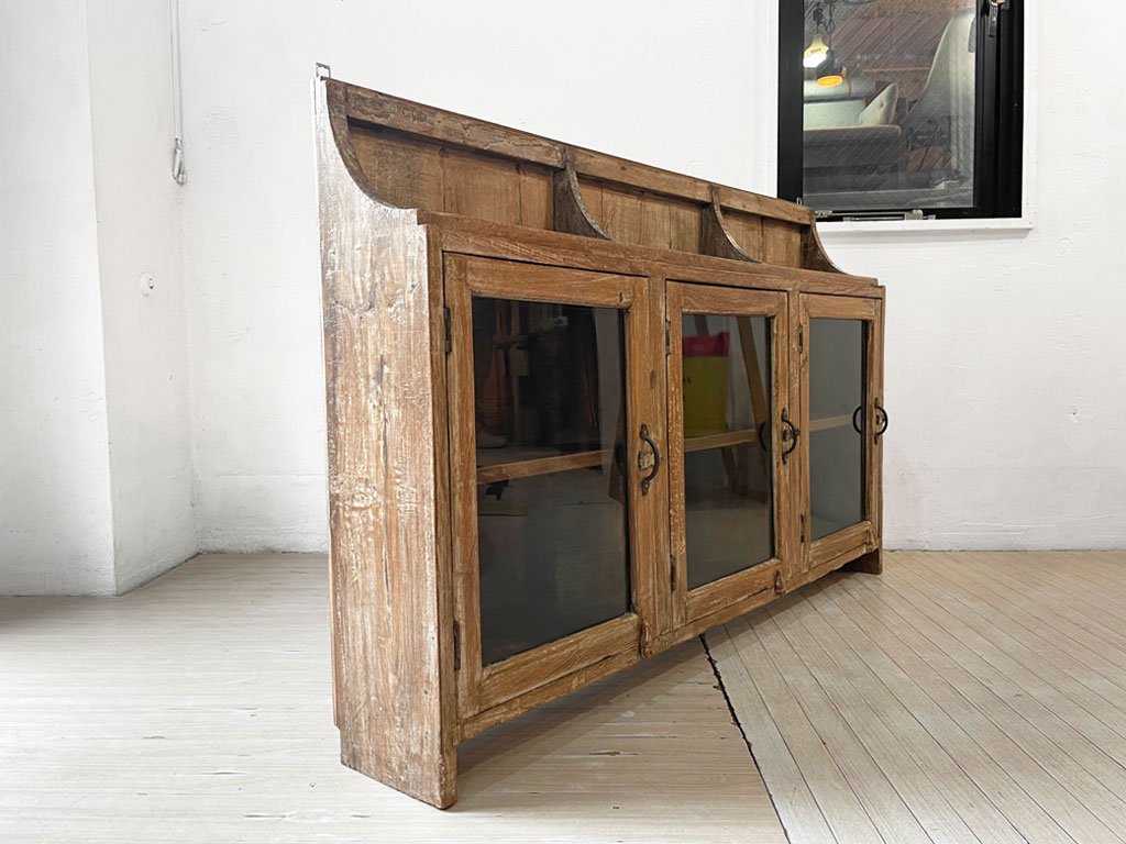 チーク古材ならではの深い味わいとシャビーなヤレた質感を併せ持ったガラスキャビネット。