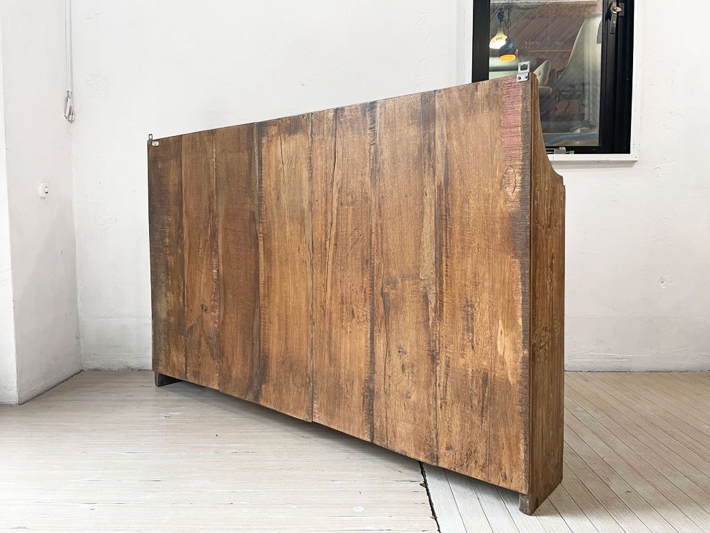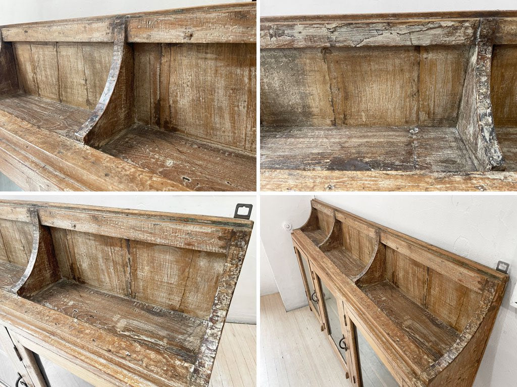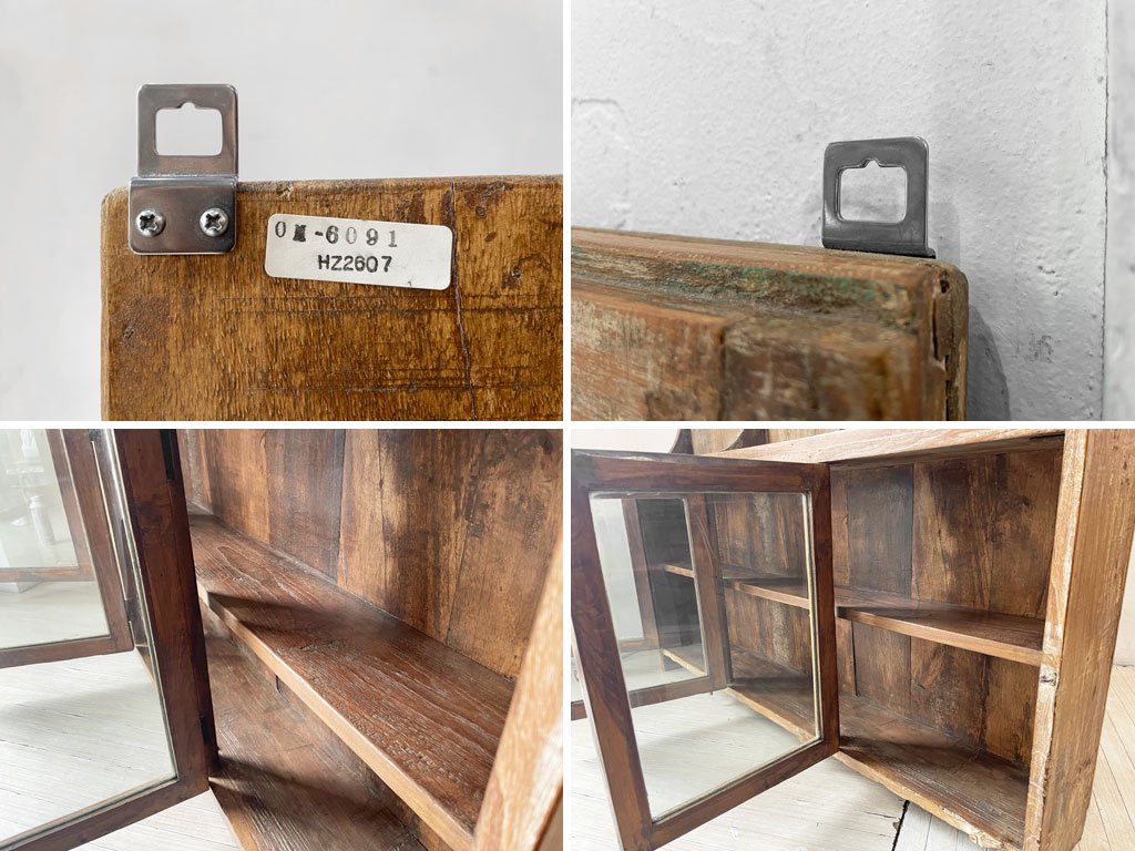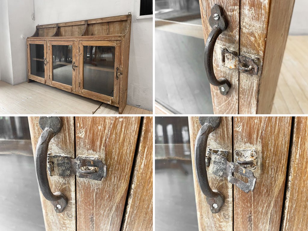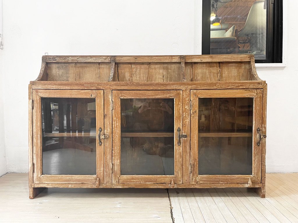 チーク古材ならではの深い味わいとシャビーなヤレた質感を併せ持ったガラスキャビネット。
