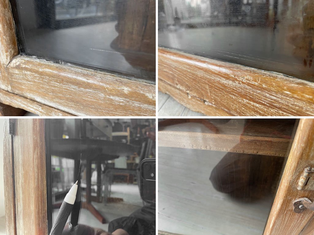 コチラのお品物はチーク古材を使用しており、古材特有の傷や欠け、ヒビや割れ、染みや汚れ、色ムラやペイントロスなどがございます。また、ガラスに若干の線傷や軽微な汚れ、くすみなどがございますが、いずれも大きく目立つもではございません。その他、施錠金具に歪みや緩みがございますが、機能に問題のある箇所なども無く、ご使用に問題のあるダメージなどもございません。チーク古材ならではの風合いを存分にお楽しみ頂けるお品物となっております。