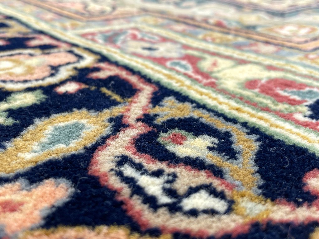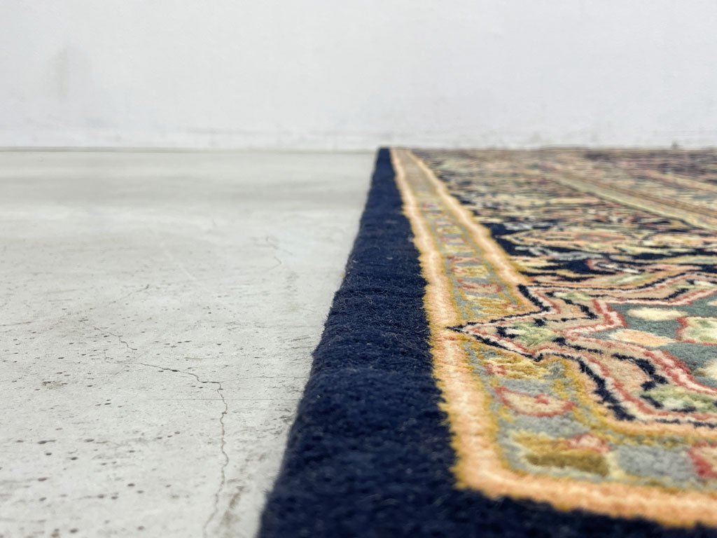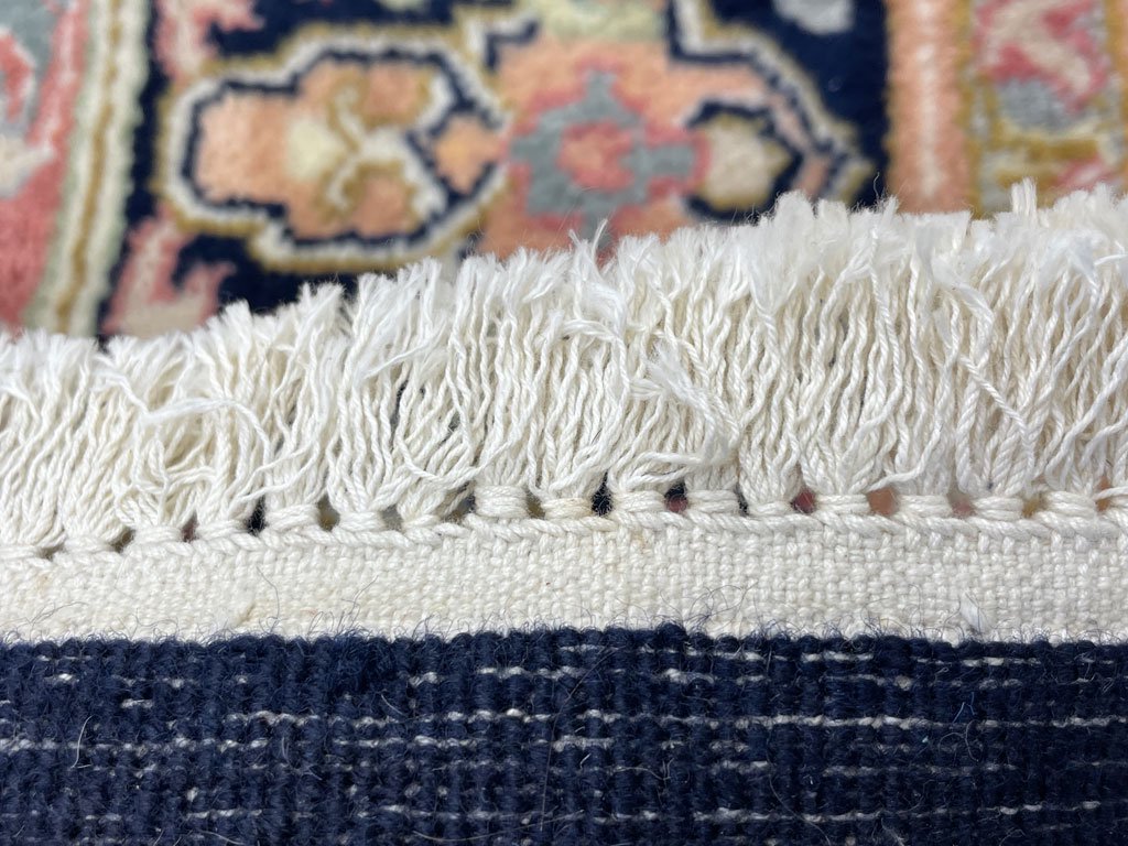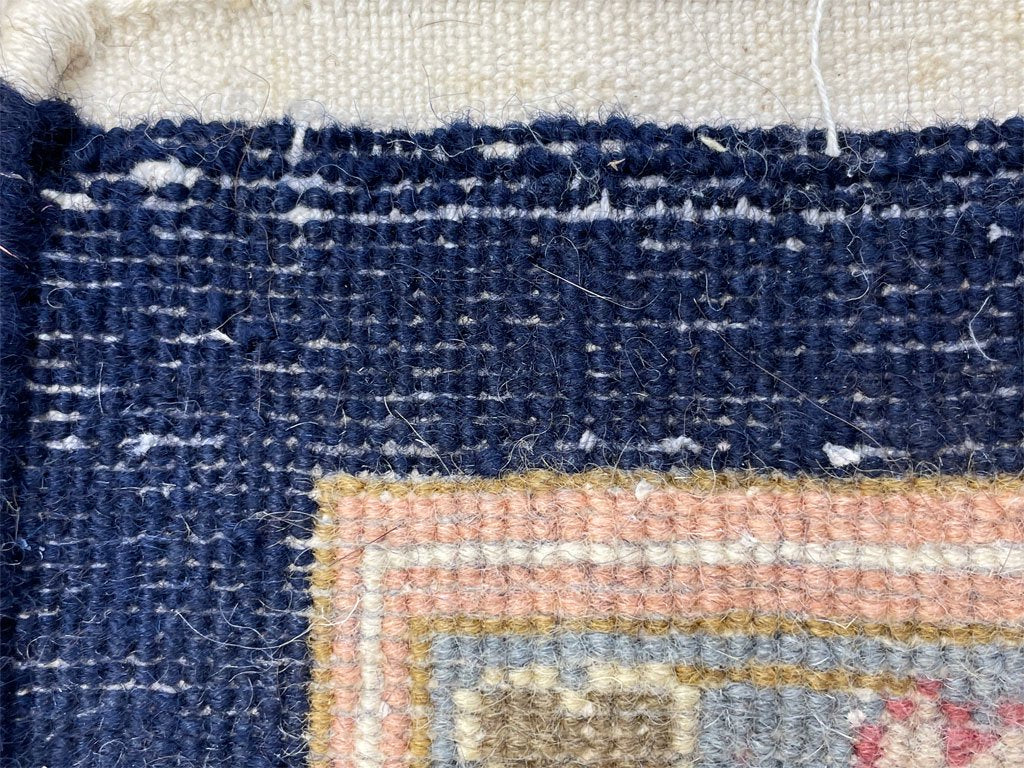 ネイビー系の明るいラグカーペットとなり、落ち着いた印象を与えるお品物。