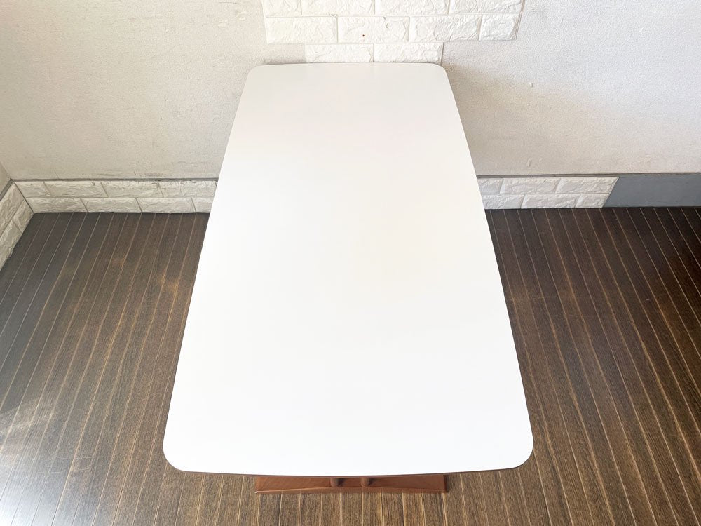 耐久性の高いホワイトメラミン天板に、コントラストが楽しめるブラウンのウォールナット脚を組み合わせた洗練されつつも懐かしさを感じさせる佇まいが魅力的。