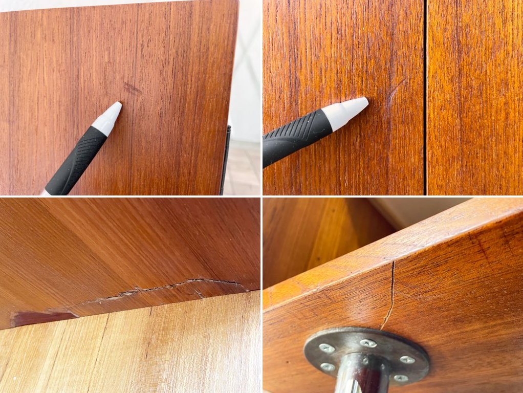 その他向かって右側の棚板裏面には割れが見られますが、しっかりと接着補修がなされている為強度に問題は無く、また上面から該当箇所が見える事はございません。キャビネット部裏面には一部脚の付け根から線状に傷が入っておりますが、こちらは割れではございません。