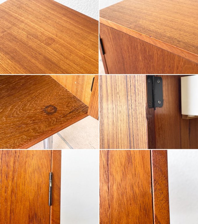 こちらはビンテージ品です。天板に僅かな染みや擦れ、角に打痕と一部パテ埋め痕、その他扉や脚先にも擦れ、庫内の染み、プラスチックトレーの黄ばみや若干の黒ずみ等経年なりのダメージはございますが、ビンテージならではの味としてお楽しみ頂けます。