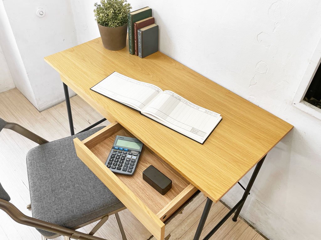 引き出し付きでデスク周りもすっきり収納可能。デスク自体がコンパクトなサイズ感ながらも、A4サイズが縦に収納できる十分なスペースがあります。