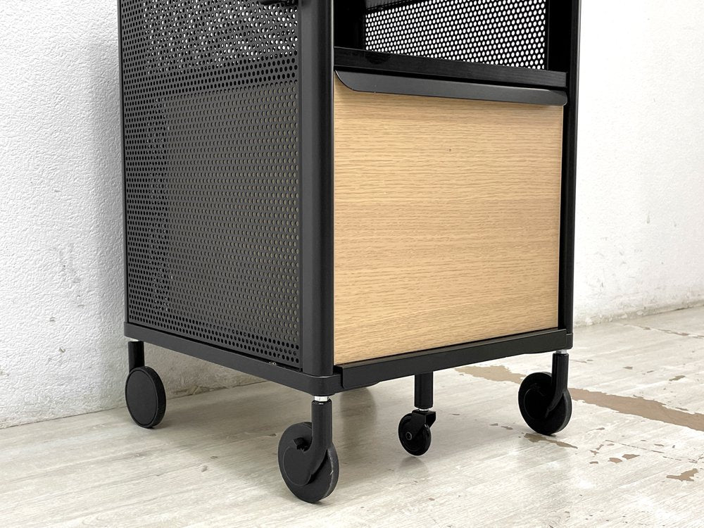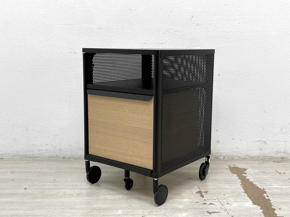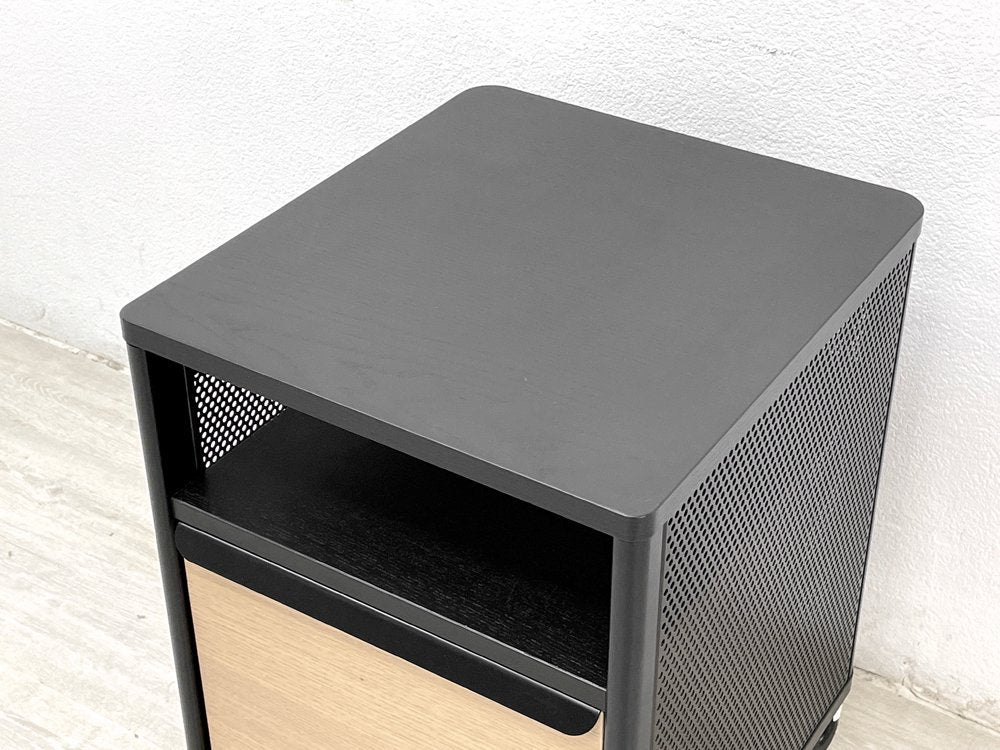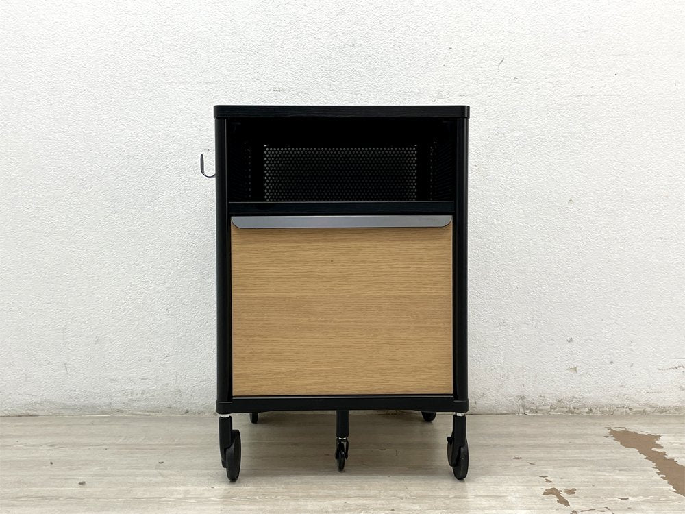 ブラック色とナチュラル色杢目を組みあわせ、メリハリを効かせたデスクワゴン。杢目の表情を残したブラック色突板やメッシュ等、ディティールの表現にもこだわったデザインは、無機質で無味乾燥なデスク周りの印象に対し、ワンランク上の都会的な雰囲気を加えてくれます。