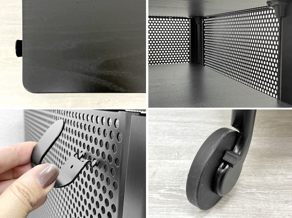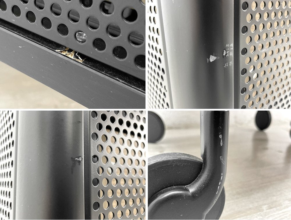 使用に伴う擦れや小傷、ペイントロス、レタッチ痕が各所に見られます。側面の下部に一箇所、ネジの食い込みによる木部表面の割れが見られますが、実用強度に問題はございません。その他キャスターの可動に問題も見られず、今後とも実用いただけるコンディションを保っております。