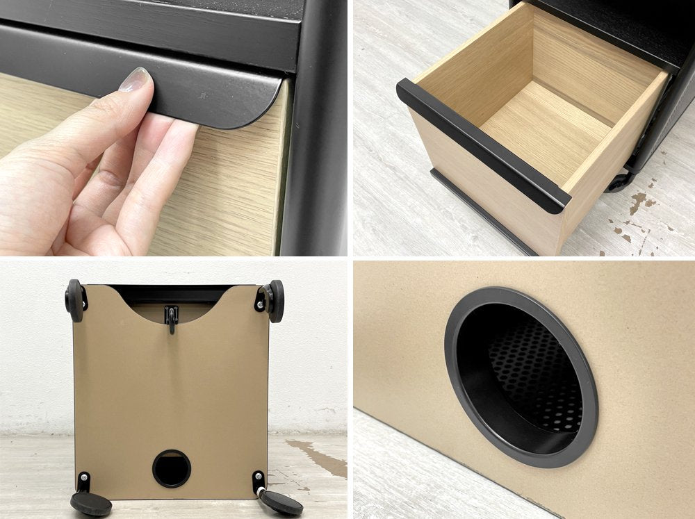 ダンパーの付いた抽斗はゆっくりと閉まり、底部にはケーブルがスッキリと配線できる穴を備えている等、機能的にも充実。スチール部には別途マグネットをご用意頂き、自分らしいカスタマイズも可能です。キャスター付きなので移動もスムーズに行えます。
