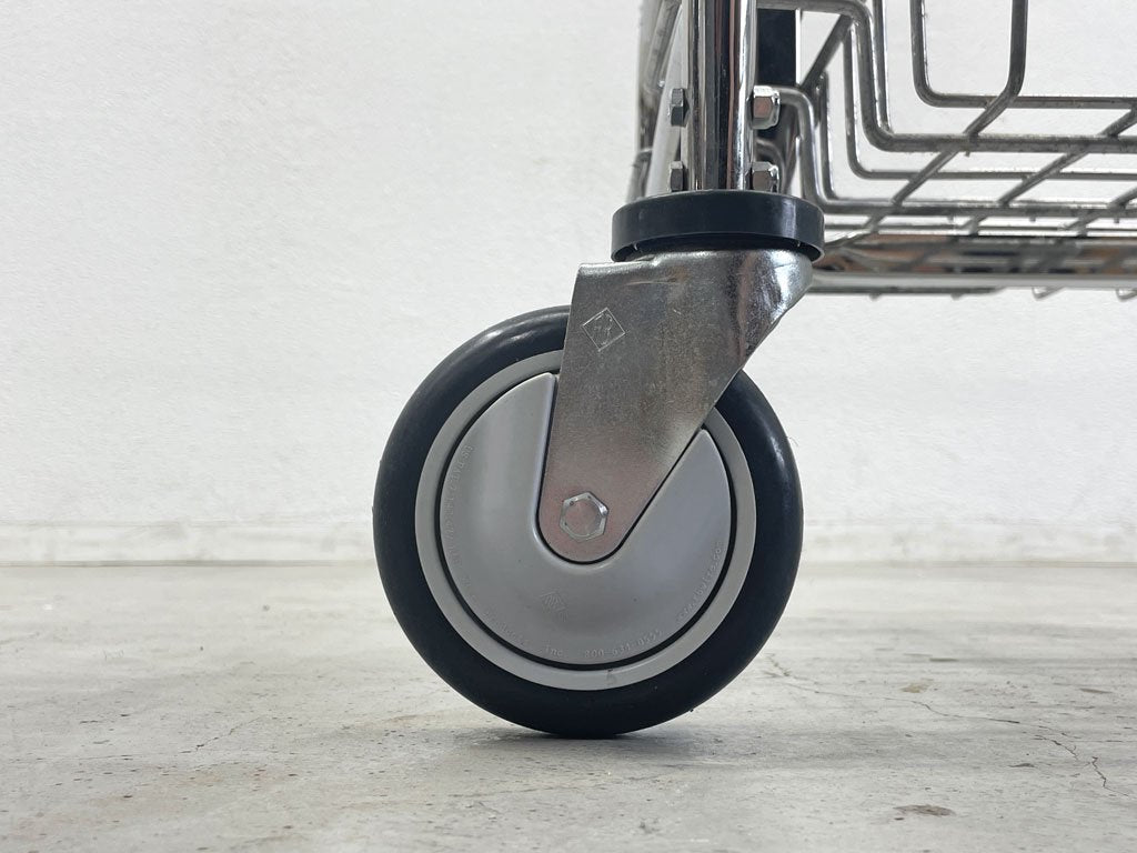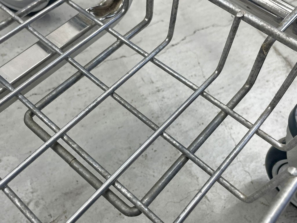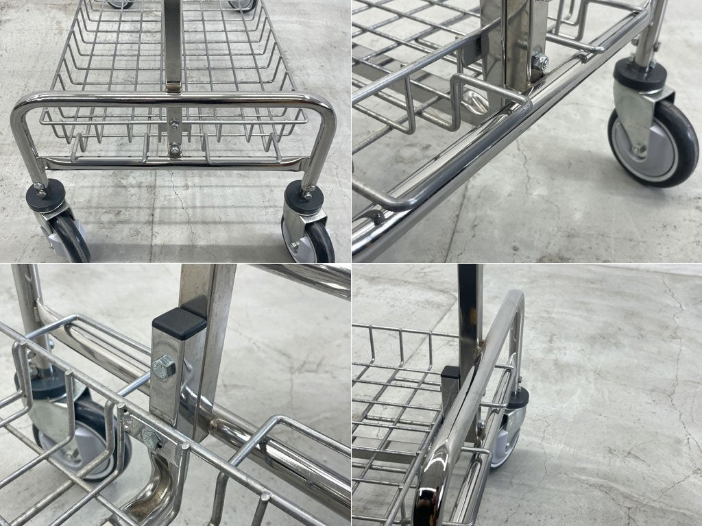 キャスター付きラックにバスケットが組まれたランドリーカートで、工業家具ならではの無骨な見た目と堅牢性が特徴的です。