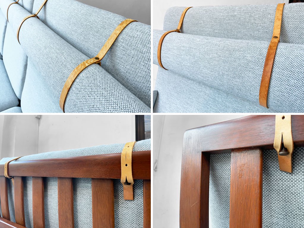 ソファにはヌメ革のレザーベルトで吊るされた位置調節可能なネッククッションが備わっており、お好みのや高さに調整してお使い頂けます。アーム部はあられ組みという技法で組まれておりデザインのアクセントにも。