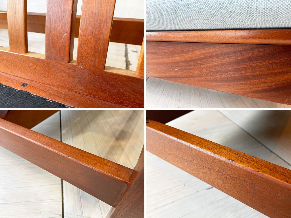 また、フレームはオーク材仕様のモノがほとんどですが、今回入荷したソファは中古市場でも取り扱いの少ないマホガニー材を使用した希少なお品物。