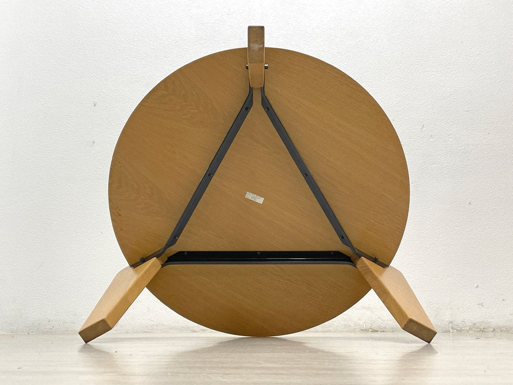 ラウンド天板と三角形のオーク無垢材による脚部を組み合わせた、それぞれのシルエットが際立つデザインは、ブラック色のスチール製コネクションエレメントによって連結され、プルーヴェらしいシンプル且つ合理的な形として完成しています。