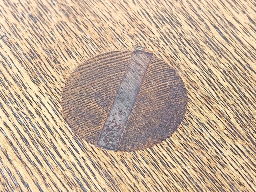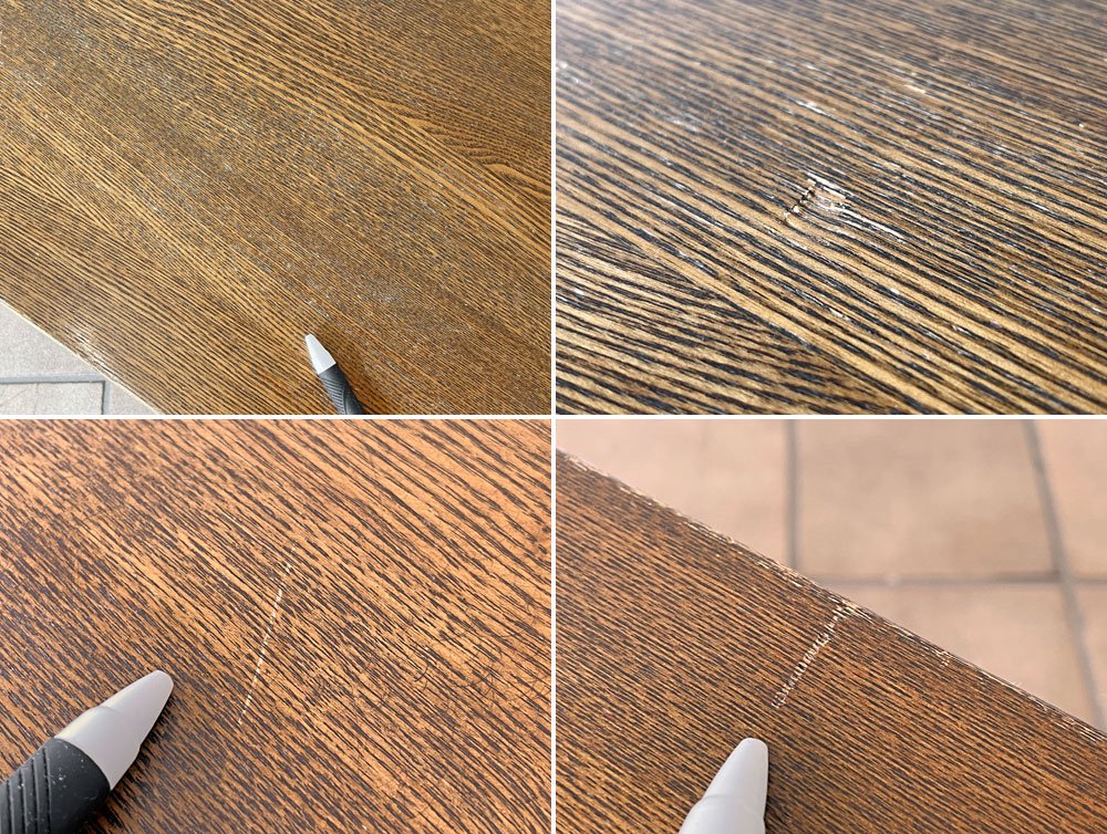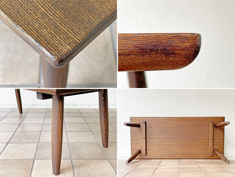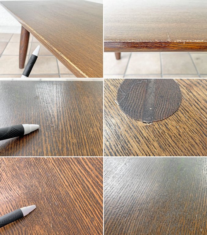 使用に伴う擦れ傷の他、スクラッチ、線傷、打痕、小さな固着やペイントロス、レタッチ痕等やや使用感はございますが、大きく美観を損なうものではございません。また天板と脚部の接合部には僅かな隙間等はございますが実用に影響するものではございません。ぐらつき等ご使用に問題となるダメージのは無く、引き続き風合いを楽しみながらお使い頂けるUSED品として概ね良好なコンディションを保っております。