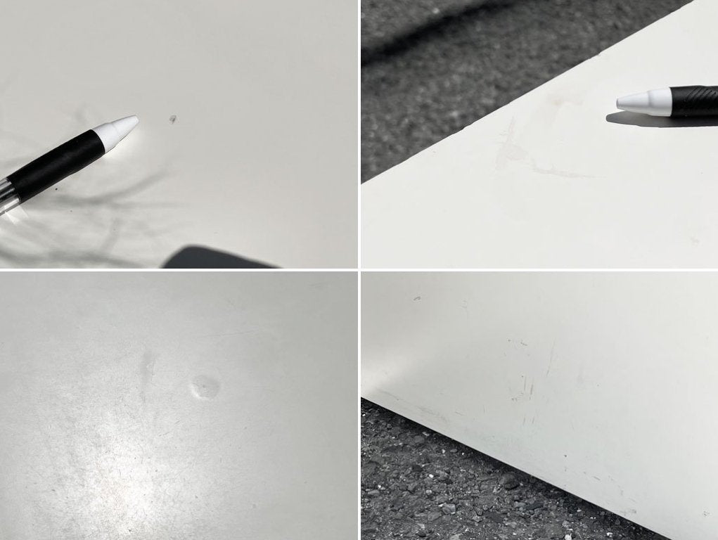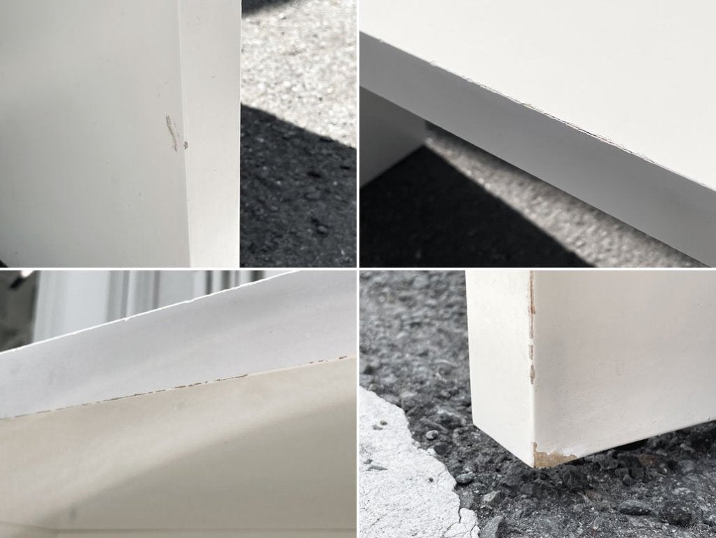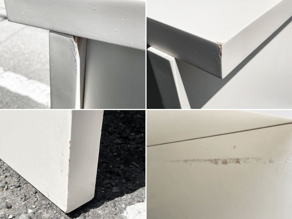 使用に伴い天板に打痕、擦れ、取りきれない付着汚れ、その他光の加減で僅かに艶の異なって見える箇所や目立たない程度の凹凸、また各部角を中心に塗装の剥げが散見され、一部リペイント痕もございます。天板には僅かに横揺れがございますが使用の支障になる程のものではございません。全体的にやや使用感はございますが、これからも安心してご使用頂けるコンディションを保っております。