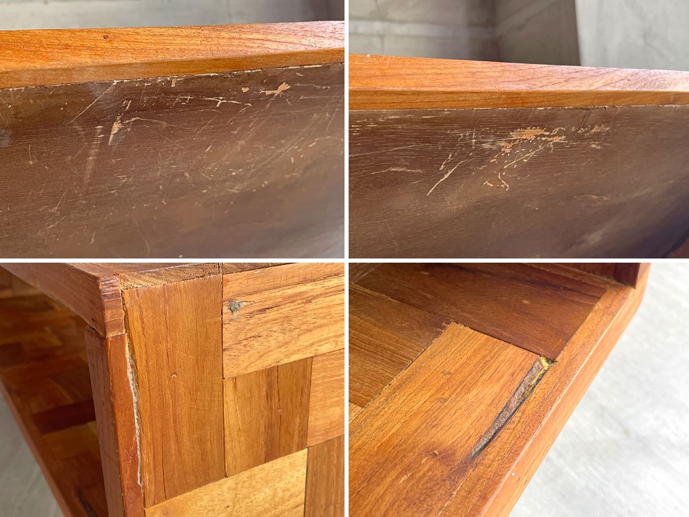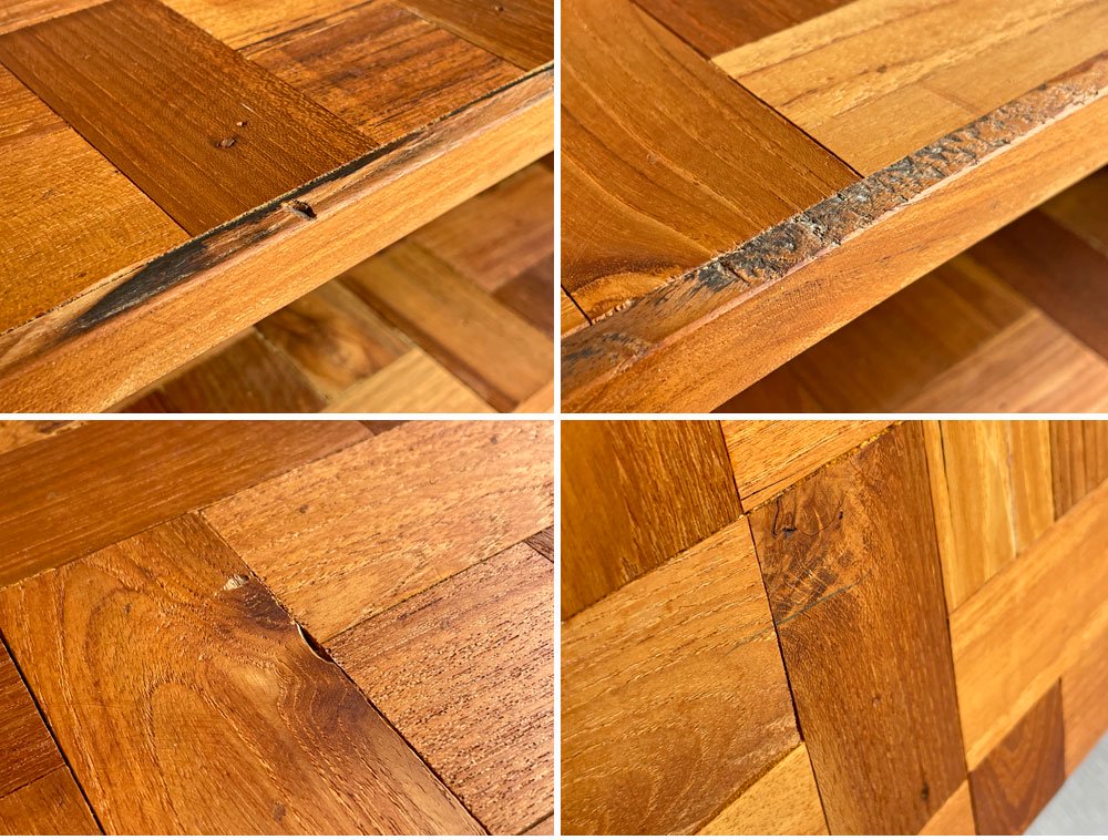こちらは古材を使用したお品物です。特有の擦れ、染み、傷、凹凸などがございますが使用上問題となる大きなダメージはございません。その他色移りや黒ずみ、天板裏には線傷がございます。多少の使用感はございますが、これからも古材の風合いとしてお楽しみ頂けるコンディションを保っております。