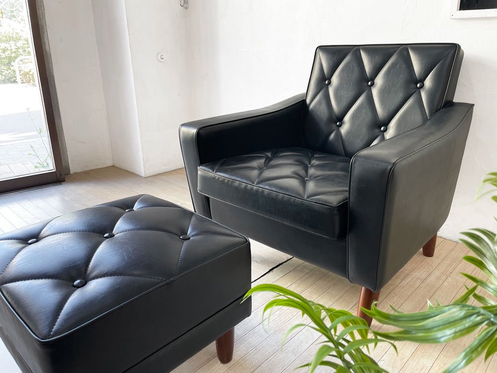 シックで大人な定番のスタンダードブラックカラ-に、ダークウォールナットカラーのコロっとした脚を組み合わせた、落ち着いた高級感溢れるデザイン。